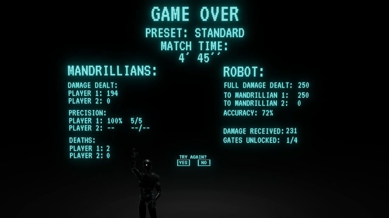 If playing on "timed" mode, killing all the Mandrillians does not finish the match; the Robot player has to actually get out of the facility before the countdown ends