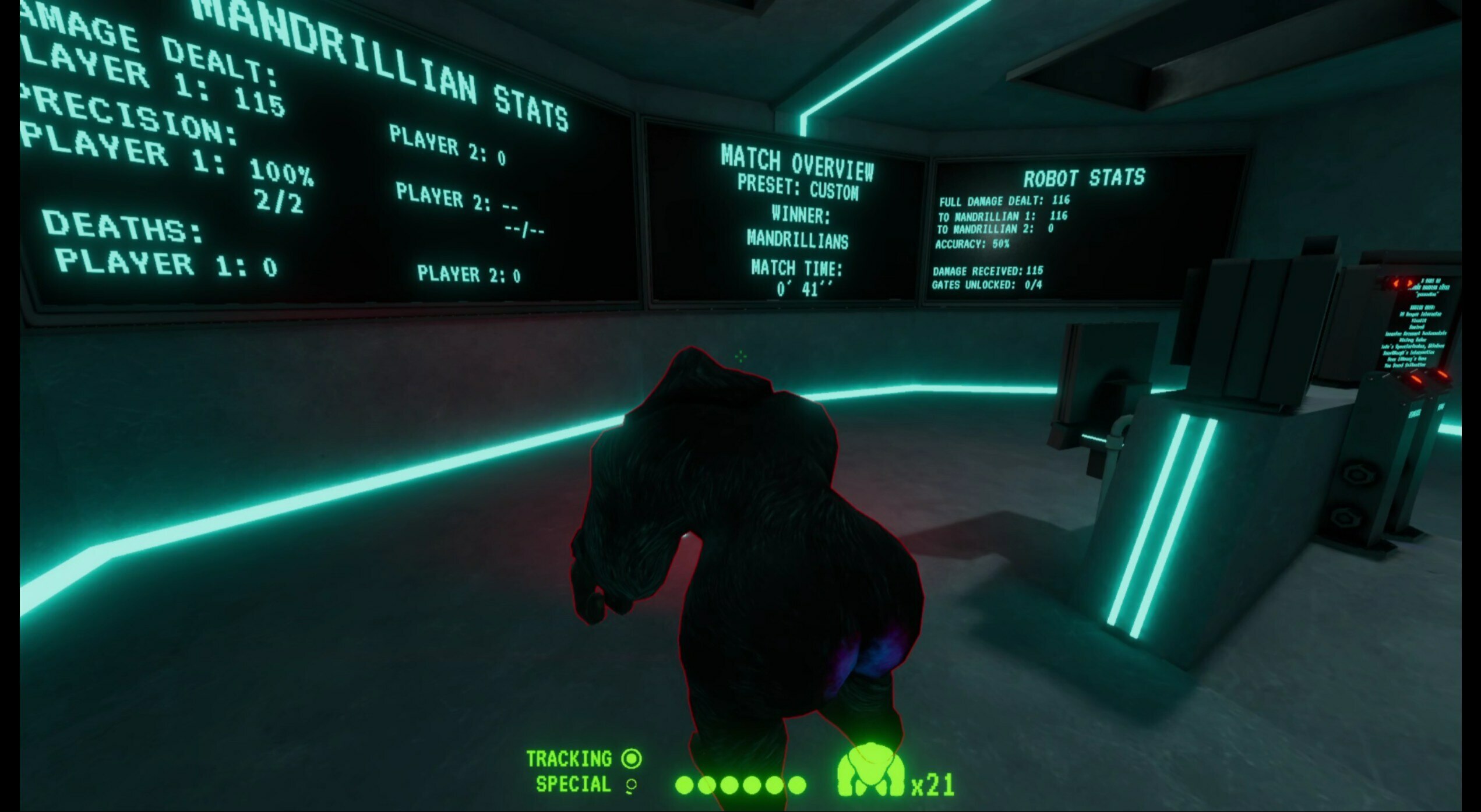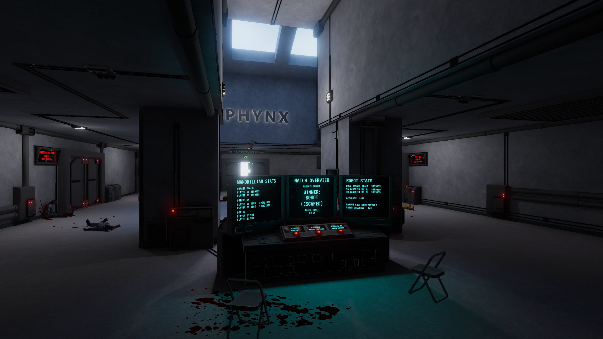 In Escape from Mandrillia there have always been three ways of ending a match: the VR player died, the VR player escaped, or the VR player killed all the Mandrillians. At the very beginning, after finishing a match the VR player used to get sent into a featureless room where they could choose to repeat the match or go back to the menu, with the PC players left behind in the facility.