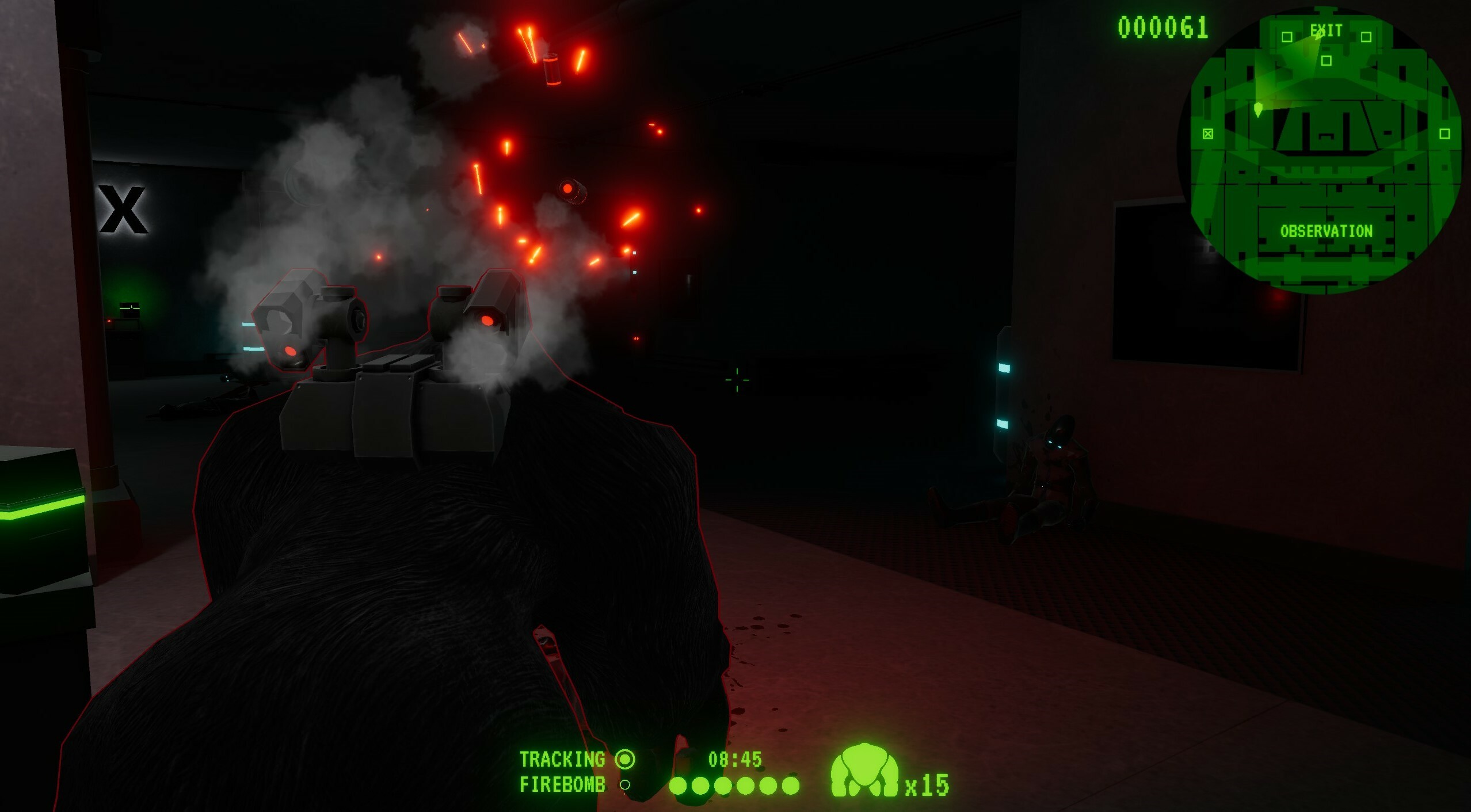 The FIREBOMB is a low-tier offensive upgrade at a cost of 300 points. It fires a burst of 4 incendiary canisters that explode after 3 seconds. If they explode very close to a Robot it will do some minor blast damage, but their strength comes from their overheating capabilities (when a Robot overheats, it will move slow and take 2x damage). The canisters are physical interactable objects, which means you can try pick them up and throwing them back as the Robot, if you dare.