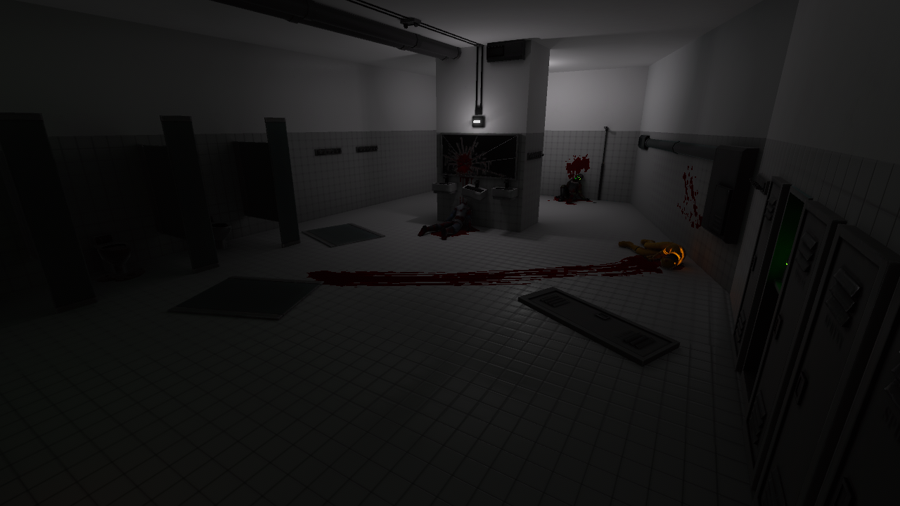 On top of being a nice hiding spot and having a few extra loot spawners, the restroom comes with a few gimmicks. I've improved the destroyable environment system that I implemented with the canteen's tables -now Mandrillians will plow through them like butter without losing their hurtbox. Try slamming through the stalls!