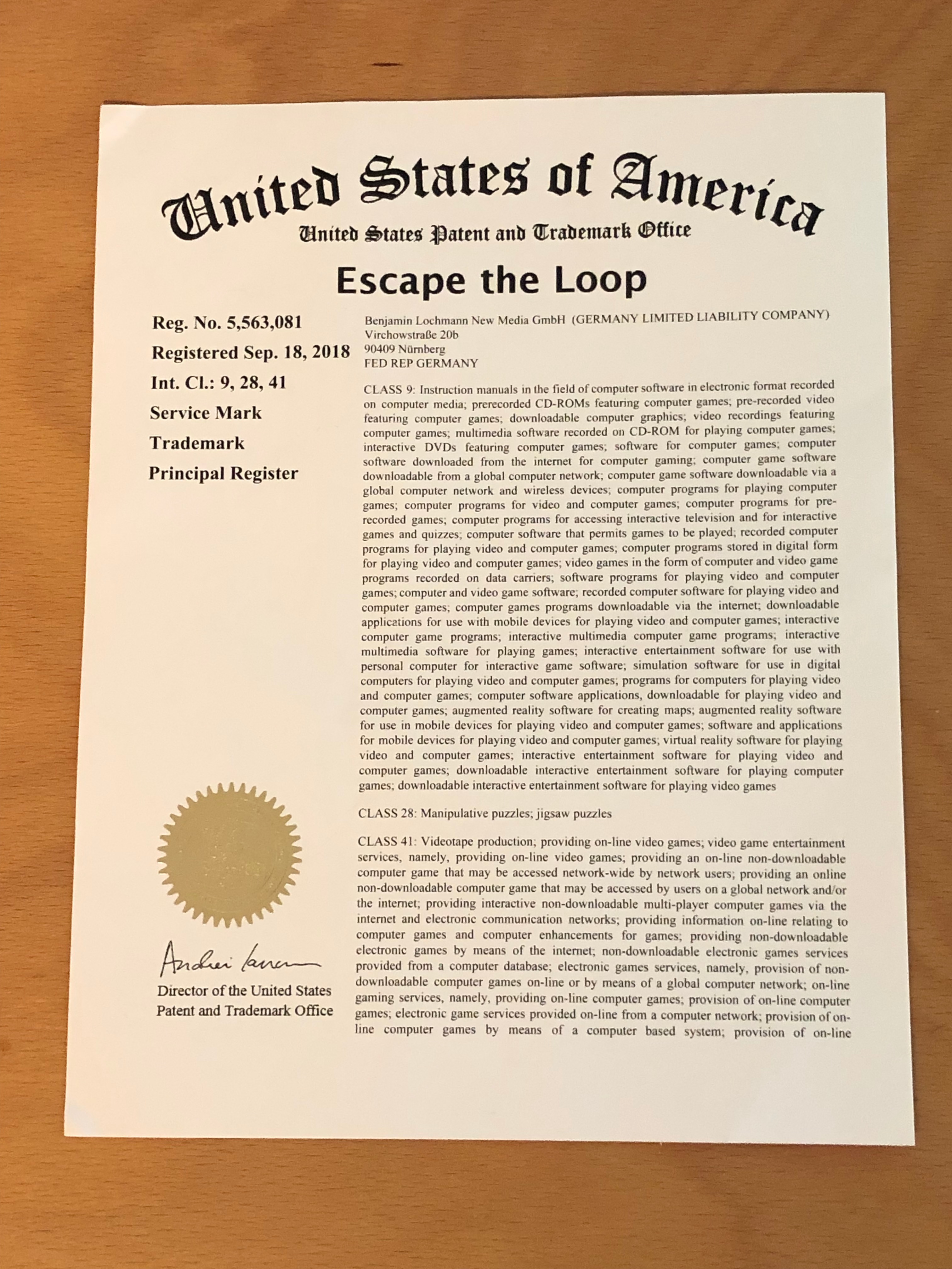 After two years of waiting, battling contesters, and countless work hours invested: Escape the Loop is now officially Escape the Loop®.