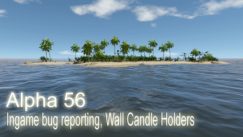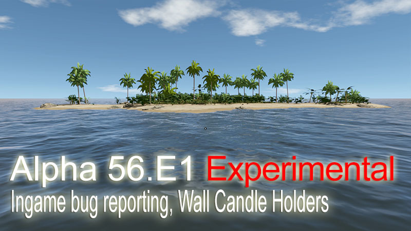 Bug Fixes: 01. Fixed: Missing Candle Icon displaying for Candle Holders while looking at them 02. Fixed: Displaying Candle level for Candle Holders always (not only when Candle is present) 03. Fixed: Sometimes Fishes swimming above water 04. Fixed: Sometimes Medium Carving stone not giving any Small Carving stones on destroying 05. Fixed: Hitting a medium Carving stone not generates enough Small Carving stones 06. Fixed: Not possible to hit the Medium Carving Stone with Hammer 07. Fixed Game UI becomes unresponsive and incorrectly working after typing Toolbelt Hotkey Numbers (3, 4, 5) in Island Name in Map 08. Fixed: Game UI becomes unresponsive and incorrectly working after typing Pocket Hotkey Numbers (1, 2) in Island Name in Map 09. Added: Localized new RUS texts (Alpha 56.E1 only) 10. Fixed: Not possible to attach items to Raft and Long Canoe 11. Fixed: Not possible to get Fish from Fish Trap