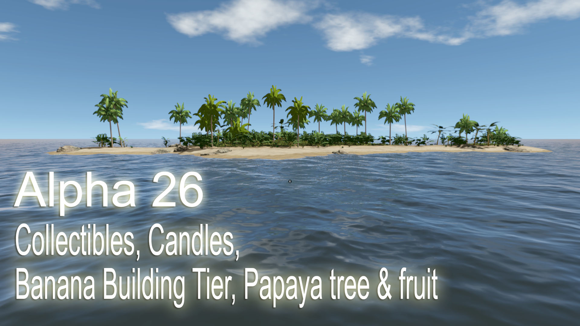 For this update we were mainly focusing on adding the new Collectibles mechanic, expanding the fire system, making the Banana trees chop-able with a couple of new features and there is a new Papaya tree and fruit.