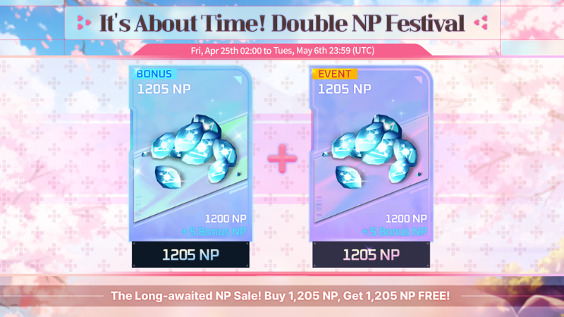 *Make sure to check that the Double NP promotion is applied on the NP purchase screen. *The Double NP bonus is only applicable once during the event period. *When purchasing NP, you will receive [1,205 Paid NP], [16 Mileage], and [1,205 Bonus Free NP] instantly. *Refunding the original purchase will also return the bonus NP and the 16 Mileage.