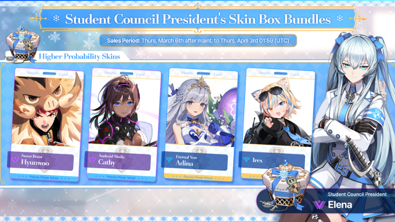 This Skin Box has around 10% total increased probability for the following skins/designs: Student Council President Elena, Sweet Beast Hyunwoo, Android Medic Cathy, Eternal Vow Adina and Irex. Additionally, you will get 1 Student Council President card to help you complete your collection more quickly.