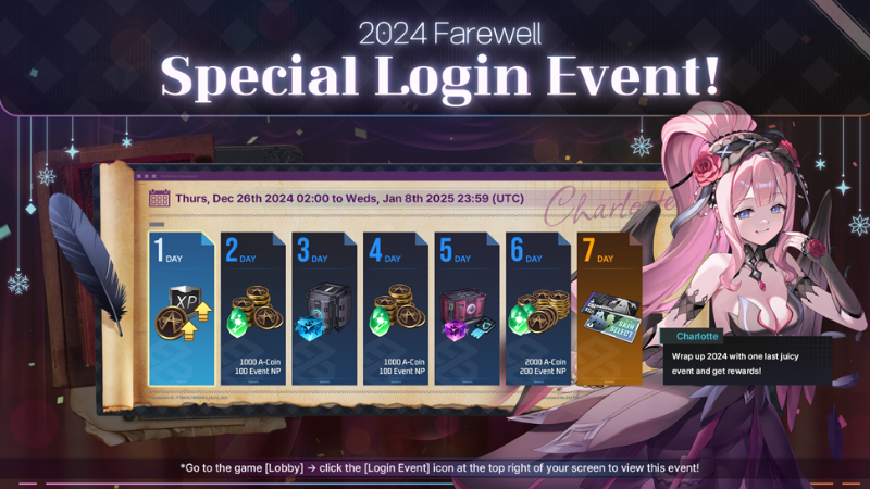 *Go to the game [Lobby] → Click the [Login Event] icon at the top right of your screen → Click the [2024 Farewell Login Event] tab. *Log in daily for 7 days during the event period to get all the 2024 Farewell: Special Login Event rewards. Event Period: Thursday, December 26th 2024 02:00 to Wednesday, January 8th 2025 23:59 (UTC)