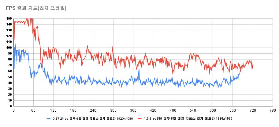 We set up about 30 different environments with different graphic cards, option settings, and in-game situations, and measured frames 11 times for both the Early Access version and the Official Launch version. Here's a comparison of the most recent frames from the Early Access version (0.87, blue line) and the Official Launch version (1.0.5, red line). The higher the frames, the smoother the movement.