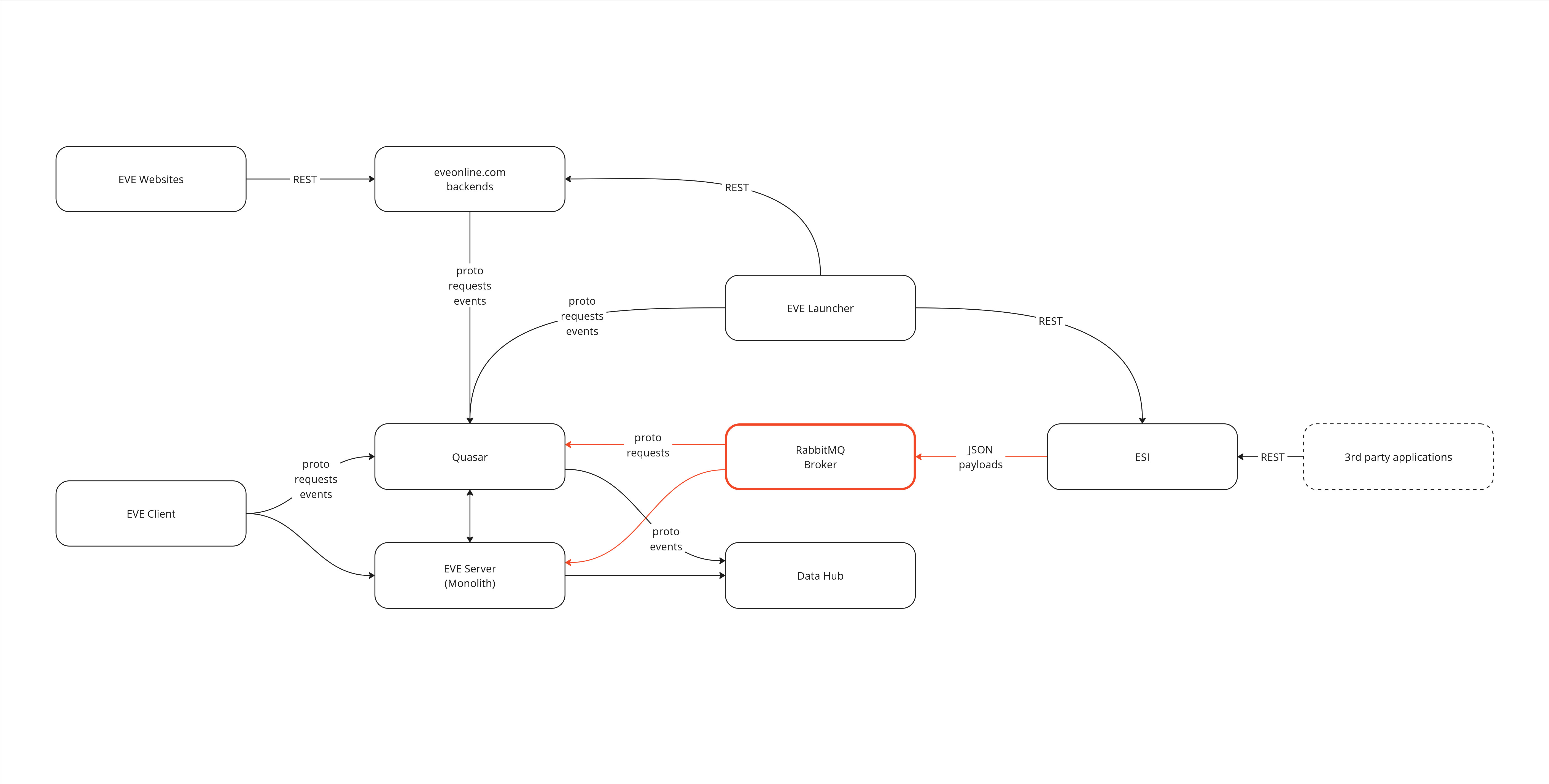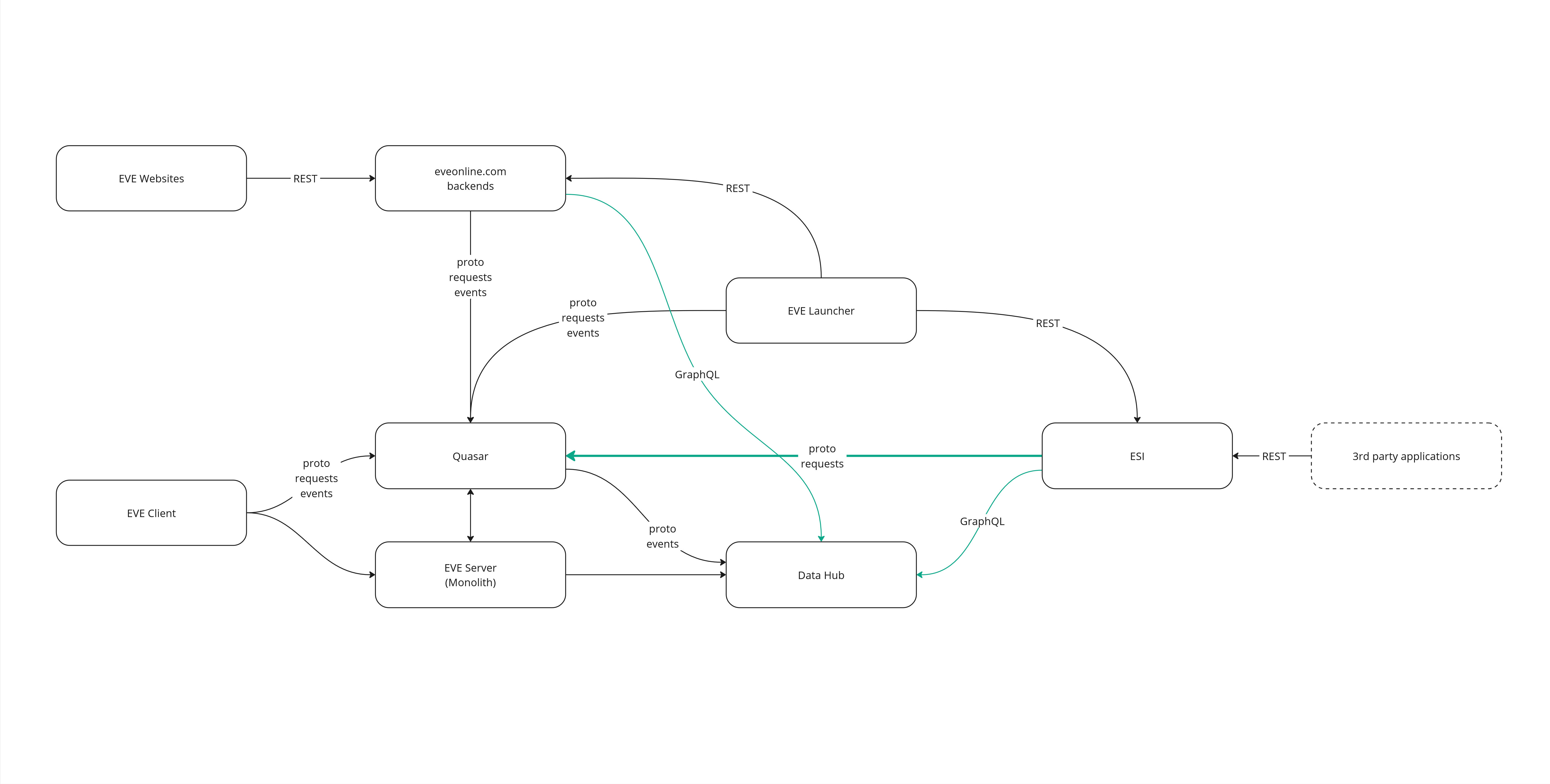 Many ESI requests are still sent directly to the Monolith, which can create performance bottlenecks and impact Tranquility. The long-term goal is to transition most read requests to the Data Hub, an internal system designed to store all game activity for analysis and monitoring. Importantly, it contains the information that ESI frequently queries. By shifting ESI’s read requests away from Monolith and Quasar and toward the Data Hub, system stability will improve, as load from third-party applications will no longer affect the game’s core infrastructure. In other words, even if ESI crashed the Data Hub (which is not meant as a challenge!), there would be no impact on the game itself. This separation would allow for increased flexibility and scalability as more third-party applications continue to rely on ESI.