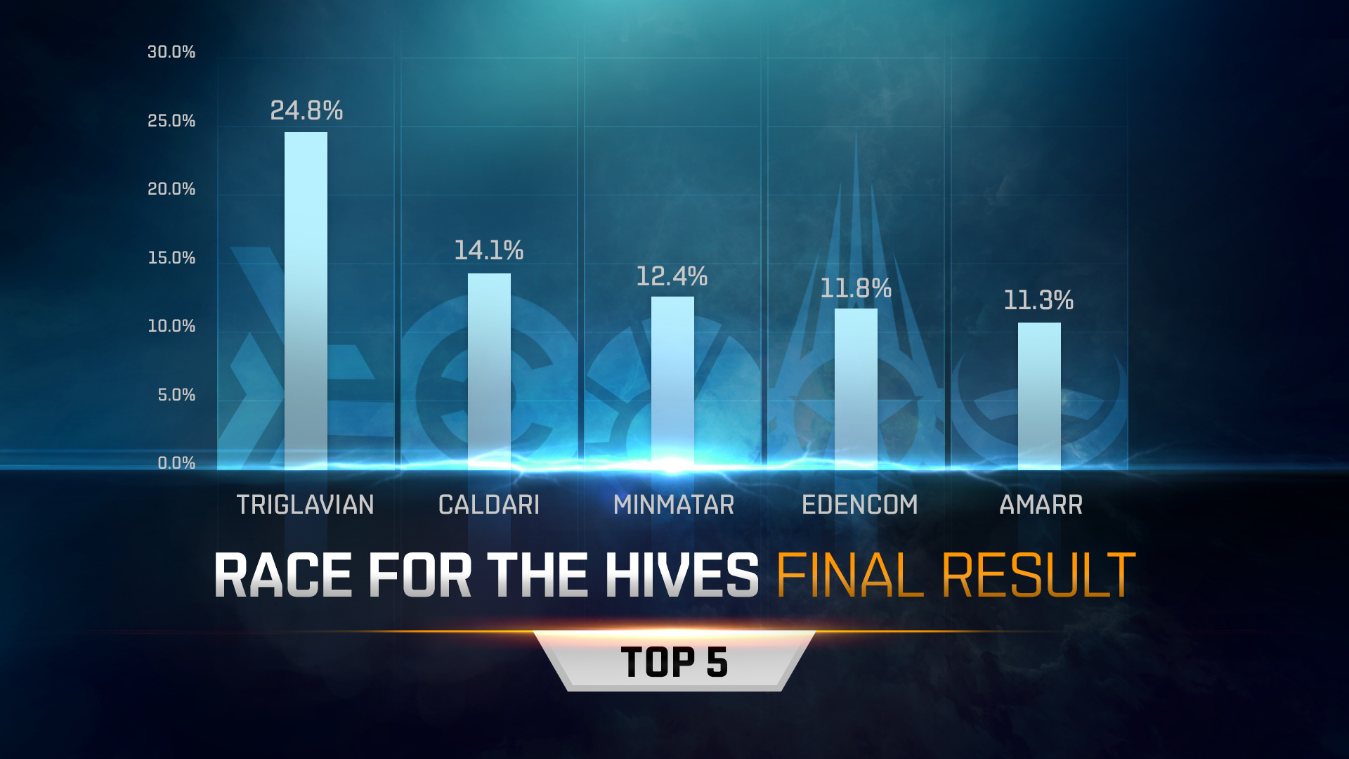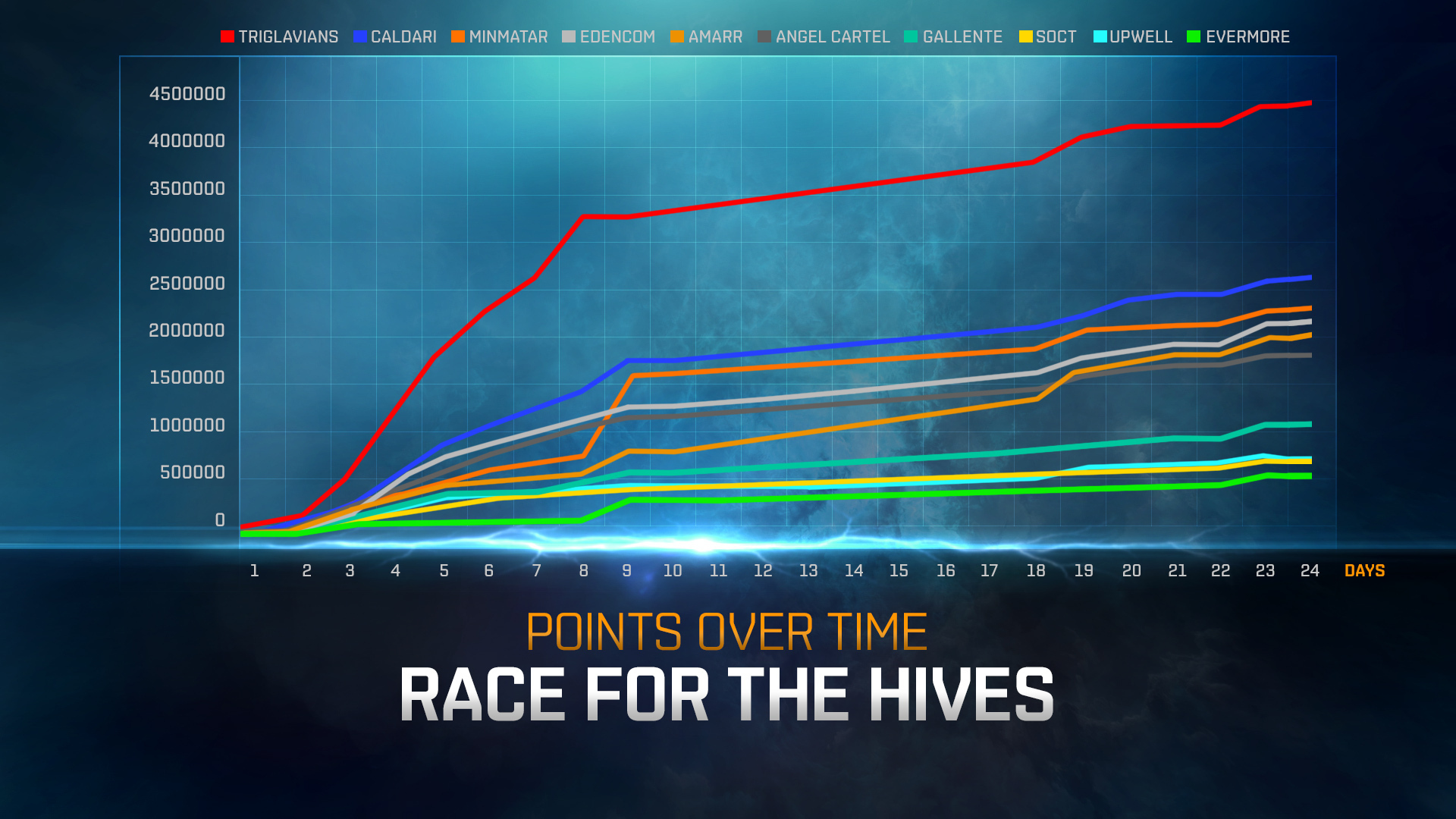 The Race for the Hives event is over, and the five top-scoring factions are establishing a presence inside Drifter wormhole systems. Here are the results for the highest scoring factions, top contributors, and contributions over time: