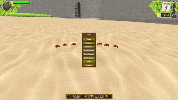 -Collection Screen: UI that shows which critters you have collected so far and if you have collected the Shimmering variant of each critter. -Bug Net special: The bug net special will be very different from other tools, instead of a powerful move you will instead gain Critter Vision highlighting critters hidden in tall grass -Dynamic spawn checking: Right now critter spawners only check if critters should despawn and be replaced by another type of critter if the player is far away, we will try to make these checks even if the player is close without having critters disappear right in front of the player -Achievements: at least 5 new achievements -Ambience based on bug proximity (cicada, bees, wasps, flies and cricket): Noisy buggers will actually affect ambiance sounds