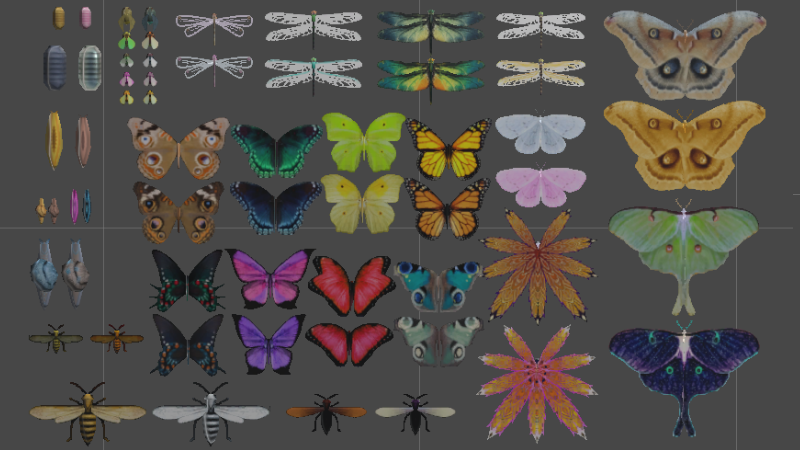 I have modeled a total of 45 bugs, but we haven't implemented their behaviors yet, the modeled bugs waiting for AI are: Wasps, Moths, Isopods, Slugs, Snails, Beetles, Ladybugs, Flies, Glowflies, Bees and Cave Poofahs.