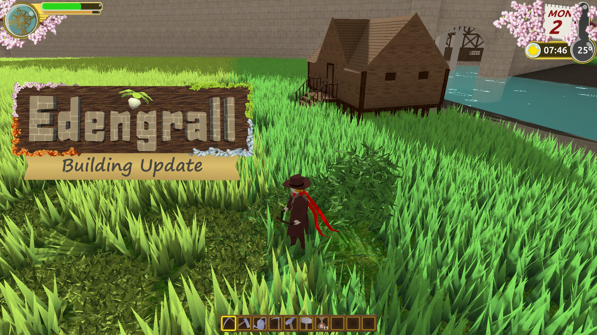 -Building system is now composed of more than 200 pieces across wooden and stone structures, also many new furniture items including interactable furniture. -Gathering system is a placeholder system that allow players to acquire many items without having to use the NPC shop -Improvements to grass and game feel