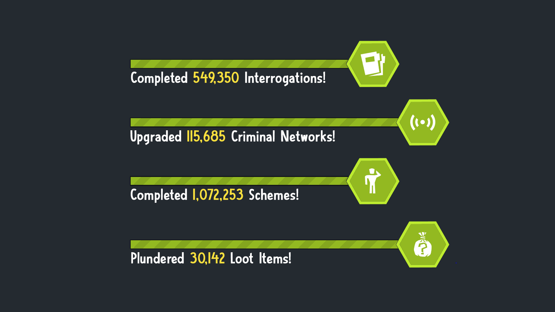 You also Interrogated a total of 154,342 P.A.T.R.I.O.T. Agents (44k over target)... We're impressed. Maybe Agent X is too. He values dedication to a cause as much as we do! Who knows, perhaps your dedication was the key to swaying his loyalty to P.A.T.R.I.O.T. in the end.