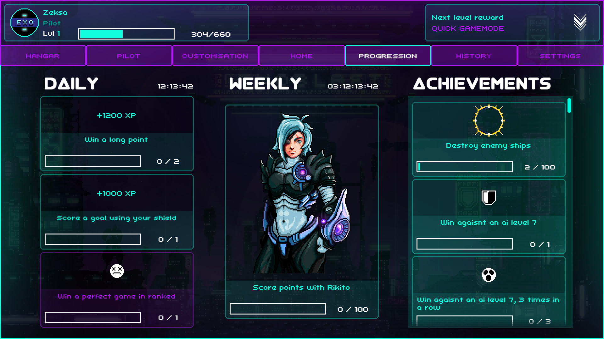 A progress screen has been added so you can track the completion of your Challenges, Daily and Weekly Quests, and Steam Achievements. A timer is there and tells you when the quests are renewed.