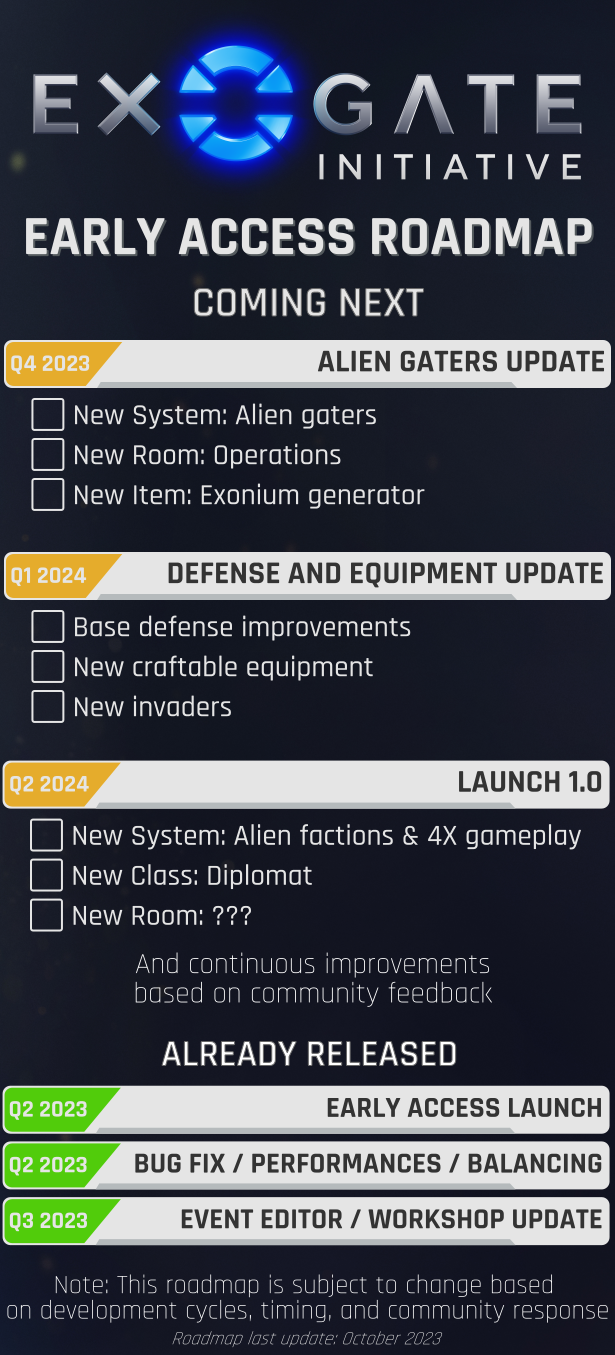 In case you missed it, we recently shared our Early Access roadmap progress. With the Alien Gaters patch now out, we’ve updated the roadmap so you know what to expect and when, as we continue towards our 1.0 launch: