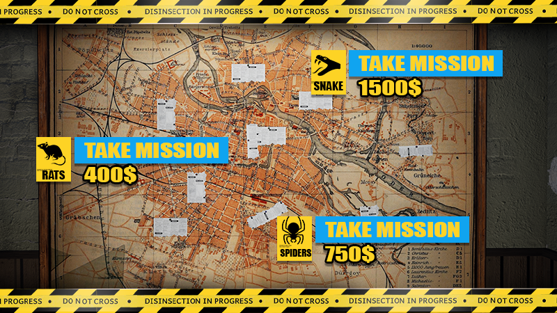 Everything starts from here! In the Exterminator Simulator, you can get most of the quests from the quest board. For additional missions, remember to check your mobile phone and answer the calls.