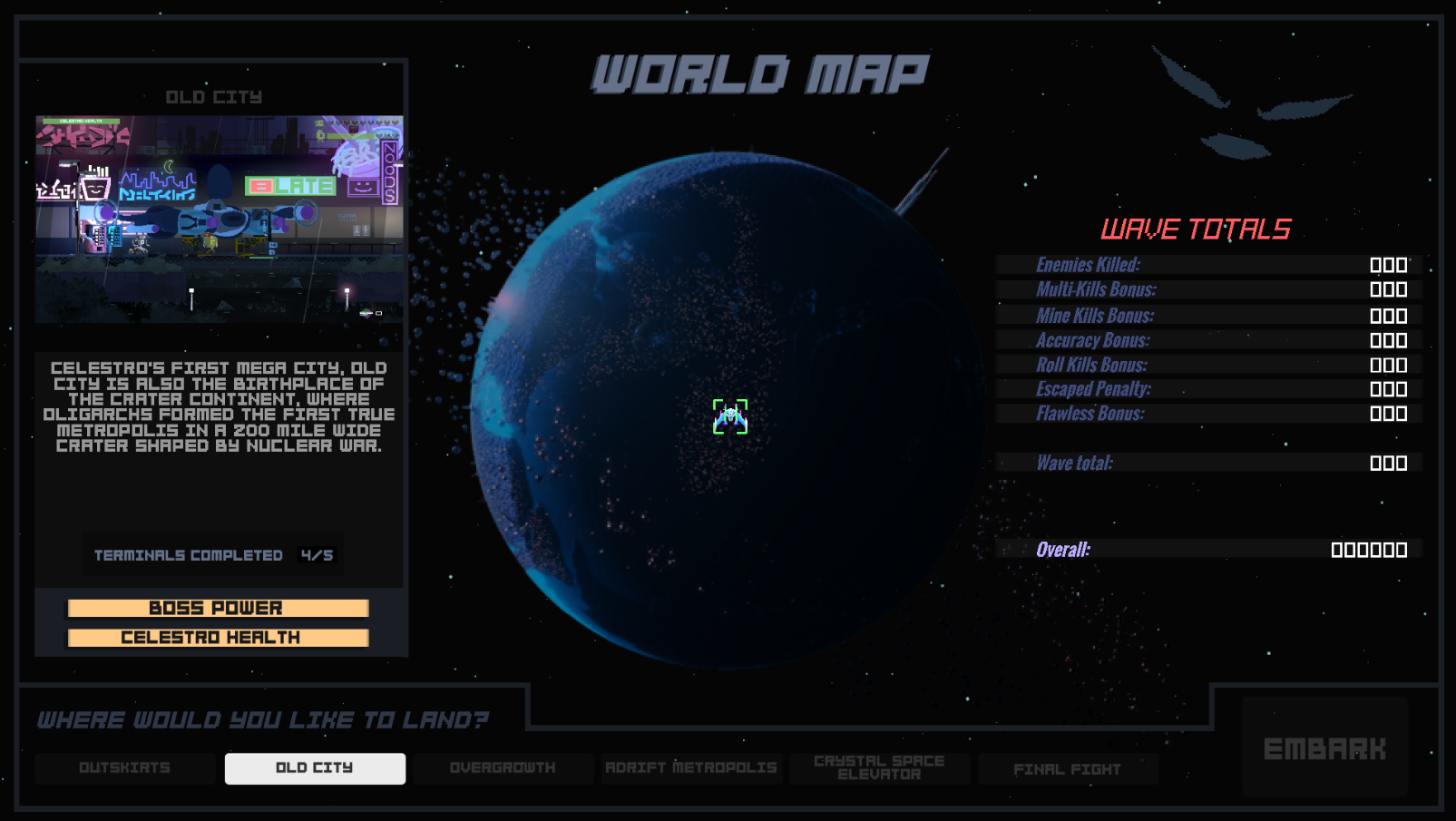 From the moment we first hit the World Map, players will be given the choice of 5 different landing zones on Celestro to explore for platforming gameplay or they can go straight for the final boss fight. Here's a look at our new World Map: