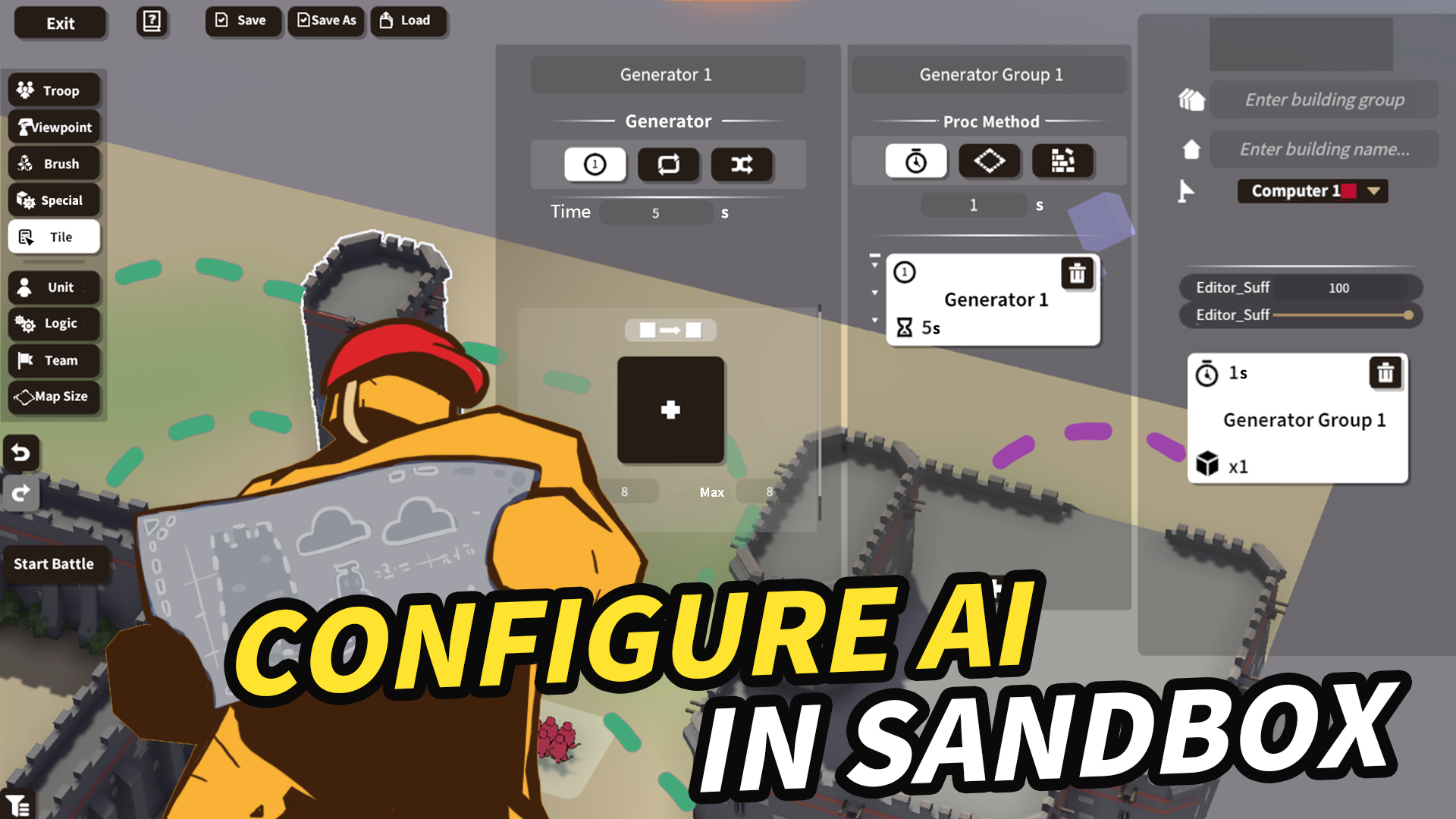 Sandbox’s new features. Added AI configuration and Enemy Generator, and expanded the map size to. More features are to come in next weeks