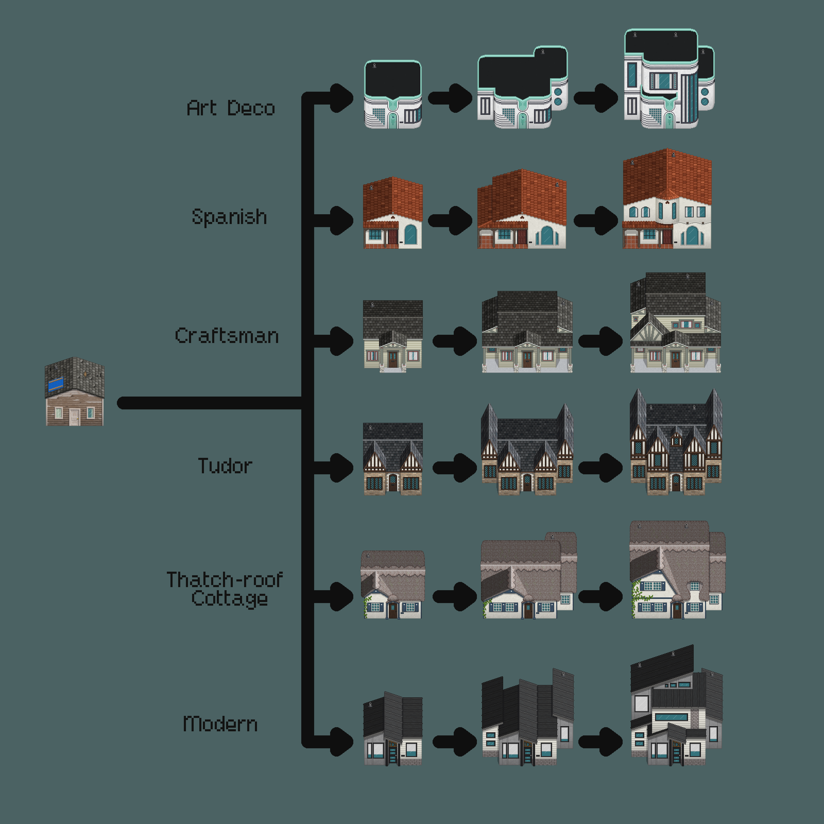 Art maker here. Since the last update, I've put together some player house exteriors you'll be able to upgrade to. All house styles will have different color options to choose from. Below is a picture of the set I just finished. I will of course be adding even more styles as development continues.
