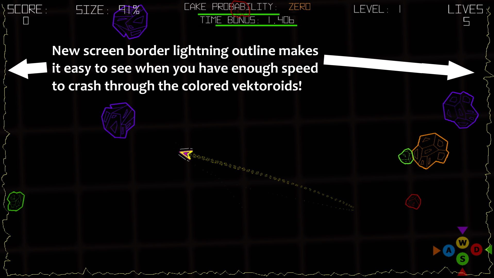 - A new lightning style screen border will indicate that you have enough speed to crash through vektoroids (You still need to be the right color)
