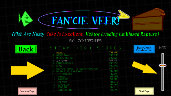 In the above image, yellow arrows point out that Steam high scores have now been added right into the game! You have the top 1,000 high scores (if there ever is that many) for both HIGH SCORES and for HIGHEST CRASH COMBO STREAKS achieved available to see right from the opening screen!