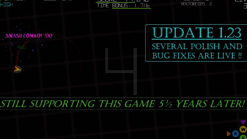 * Adjusted the wrap around on the Vektoroids so that they will mostly disappear off one side of the screen completely before wrapping around to the other side (Before you would see half of a Vektorid on each side of the screen as it wrapped around)