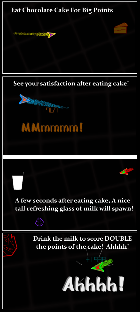 In update 1.05, I've added a nice tall glass of refreshing milk that will spawn any time you eat some chocolate cake. Get it quickly as it doesn't stay on the screen long but it is worth DOUBLE the points of whatever the cake was worth if you can collect it in time!