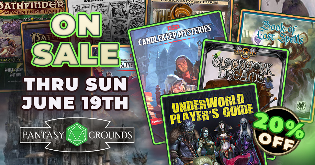 You will need Fantasy Grounds Unity to use any of these newer modules. Upgrade now at a 50% discount on top of the current 25% off sale. Then you can take advantage of these great modules - now on sale!https://store.steampowered.com/app/1196310 Upgrade Bundles:https://store.steampowered.com/bundle/15993/Upgrade_from_FG_Classic_to_FG_Unity_Ultimate_license/ https://store.steampowered.com/bundle/13834/Upgrade_from_Fantasy_Grounds_to_Fantasy_Grounds_Unity_Standard_license/ POPULAR ITEMS ON SALE SUNDAY, 10TH OF JULY 2022 https://store.steampowered.com/app/1460240 https://store.steampowered.com/app/1506070 https://store.steampowered.com/app/1396550 https://store.steampowered.com/app/1396560 https://store.steampowered.com/app/1782830 https://store.steampowered.com/app/1563290 https://store.steampowered.com/app/1535740 https://store.steampowered.com/app/1496440 https://store.steampowered.com/app/1656540 https://store.steampowered.com/app/1396430 https://store.steampowered.com/app/1791340 https://store.steampowered.com/app/1813040 https://store.steampowered.com/app/1944890 https://store.steampowered.com/app/1670730 https://store.steampowered.com/app/1490280 https://store.steampowered.com/app/1410940 https://store.steampowered.com/app/1377860 https://store.steampowered.com/app/1634140 https://store.steampowered.com/app/720130 NEW RELEASES - FANTASY GROUNDS VTT - Week of June 13th, 2022 June 17, 2022