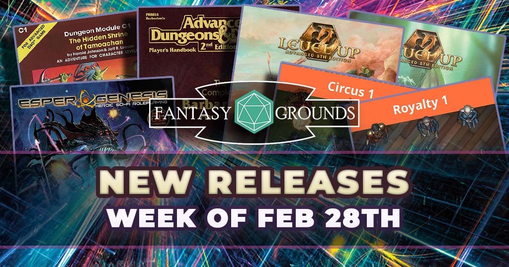 New Releases since Monday, 28th of February 2022D&D Classics - C1 The Hidden Shrine of Tamoachan (1E) Publisher: Wizards of the Coast System: D&D Classics - AD&D 1E/2EType: Adventurehttps://store.steampowered.com/app/1870780 D&D Classics: The Complete Barbarian's Handbook Publisher: Wizards of the Coast System: D&D Classics - AD&D 1E/2EType: Accessoryhttps://store.steampowered.com/app/1615720 Starfinder Flip-Tiles - Space Station Starter Set Publisher: Paizo Inc.System: Generic Add-onsType: Map Packhttps://store.steampowered.com/app/1886560 Starfinder RPG - Flip-Tiles - Alien Planet Moonscape Expansion Publisher: Paizo Inc.System: Generic Add-onsType: Map Packhttps://store.steampowered.com/app/1893520 Starfinder RPG - Flip-Tiles - City Alien Quarter Expansion Publisher: Paizo Inc.System: Generic Add-onsType: Map Packhttps://store.steampowered.com/app/1893790 Level Up Adventurer's Guide Publisher: EN PublishingSystem: 5E CompatibleType: Core Ruleshttps://store.steampowered.com/app/1905630 Level Up Monstrous Menagerie Publisher: EN PublishingSystem: 5E CompatibleType: Core Ruleshttps://store.steampowered.com/app/1909460 Esper Genesis 5E Core Manual Publisher: Indie PublishersSystem: 5E CompatibleType: Core Ruleshttps://store.steampowered.com/app/1897790 Jans Token Pack 34 - Circus Publisher: Indie PublishersSystem: Generic Add-onsType: Token Packhttps://store.steampowered.com/app/1893630 Jans Token Pack 36 - The Royal Court Publisher: Indie PublishersSystem: Generic Add-onsType: Token Packhttps://store.steampowered.com/app/1893680