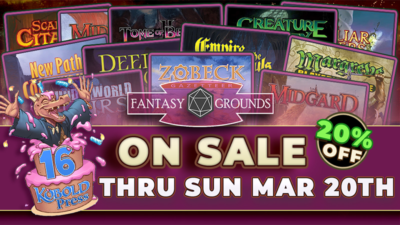ON SALE THIS WEEK THRU SUNDAY, 20TH OF MARCH 2022D&D Classics: Temple of Elemental Evil Publisher: Wizards of the Coast System: D&D Classics - AD&D 1E/2EType: Adventurehttps://store.steampowered.com/app/1108650 D&D vs Rick and Morty Publisher: Wizards of the Coast System: D&D fifth editionType: Accessoryhttps://store.steampowered.com/app/1188120 D&D Icewind Dale Rime of the Frostmaiden Publisher: Wizards of the Coast System: D&D fifth editionType: Adventurehttps://store.steampowered.com/app/1396430 D&D Classics: Night Below: An Underdark Campaign (2E) Publisher: Wizards of the Coast System: D&D Classics - AD&D 1E/2EType: Adventurehttps://store.steampowered.com/app/1452520 Starfinder Alien Archive 2 Publisher: Paizo Inc.System: StarfinderType: Core Ruleshttps://store.steampowered.com/app/985520 Pathfinder 2 RPG - Bestiary 2 Publisher: Paizo Inc.System: Pathfinder 2.0Type: Core Ruleshttps://store.steampowered.com/app/1347890 Pathfinder Roleplaying Game: Villain Codex Publisher: Paizo Inc.System: Pathfinder RPG and D&D 3.5/ OGLType: Accessoryhttps://store.steampowered.com/app/1385490 Sanctuary of Belches (5E) Publisher: Kobold PressSystem: 5E CompatibleType: Accessoryhttps://store.steampowered.com/app/555840 Cat & Mouse (5E) Publisher: Kobold PressSystem: 5E CompatibleType: Adventurehttps://store.steampowered.com/app/625110 Blood Vaults of Sister Alkava (5E) Publisher: Kobold PressSystem: 5E CompatibleType: Adventurehttps://store.steampowered.com/app/629900 Grimalkin (5E) Publisher: Kobold PressSystem: 5E CompatibleType: Adventurehttps://store.steampowered.com/app/645660 Demon Cults & Secret Societies Publisher: Kobold PressSystem: 5E CompatibleType: Accessoryhttps://store.steampowered.com/app/698840 Midgard Heroes Publisher: Kobold PressSystem: 5E CompatibleType: Accessoryhttps://store.steampowered.com/app/727870 Southlands Heroes Publisher: Kobold PressSystem: 5E CompatibleType: Accessoryhttps://store.steampowered.com/app/732200 Unlikely Heroes Publisher: Kobold PressSystem: 5E CompatibleType: Accessoryhttps://store.steampowered.com/app/732220 Prepared 2: A Dozen One Shot Adventures for 5th Edition Publisher: Kobold PressSystem: 5E CompatibleType: Accessoryhttps://store.steampowered.com/app/752990 Wrath of River King Publisher: Kobold PressSystem: 5E CompatibleType: Adventurehttps://store.steampowered.com/app/799030 Eldritch Lairs Publisher: Kobold PressSystem: 5E CompatibleType: Adventurehttps://store.steampowered.com/app/823150 Creature Codex Publisher: Kobold PressSystem: 5E CompatibleType: Accessoryhttps://store.steampowered.com/app/954800 Creature Codex Lairs Publisher: Kobold PressSystem: 5E CompatibleType: Accessoryhttps://store.steampowered.com/app/959070 Midgard Heroes Handbook Publisher: Kobold PressSystem: 5E CompatibleType: Settinghttps://store.steampowered.com/app/1068710 Streets of Zobeck Publisher: Kobold PressSystem: 5E CompatibleType: Accessoryhttps://store.steampowered.com/app/1098950 Margreve Player's Guide Publisher: Kobold PressSystem: 5E CompatibleType: Accessoryhttps://store.steampowered.com/app/1097640 Zobeck Gazetteer Publisher: Kobold PressSystem: 5E CompatibleType: Accessoryhttps://store.steampowered.com/app/1108770 The Raven's Call Publisher: Kobold PressSystem: 5E CompatibleType: Adventurehttps://store.steampowered.com/app/1123860 Warlock Lairs Volume 1 Publisher: Kobold PressSystem: 5E CompatibleType: Adventurehttps://store.steampowered.com/app/1098970 12 Peculiar Towers Publisher: Kobold PressSystem: 5E CompatibleType: Adventurehttps://store.steampowered.com/app/1140920 Last Gasp Publisher: Kobold PressSystem: 5E CompatibleType: Adventurehttps://store.steampowered.com/app/1153240 Tomb of Tiberesh Publisher: Kobold PressSystem: 5E CompatibleType: Adventurehttps://store.steampowered.com/app/1165160 Necropolis of the Mailed Fist Publisher: Kobold PressSystem: 5E CompatibleType: Adventurehttps://store.steampowered.com/app/1190940 Courts of the Shadow Fey Publisher: Kobold PressSystem: 5E CompatibleType: Adventurehttps://store.steampowered.com/app/1199750 Empire of the Ghouls Publisher: Kobold PressSystem: 5E CompatibleType: Adventurehttps://store.steampowered.com/app/1300980 Underworld Player's Guide Publisher: Kobold PressSystem: 5E CompatibleType: Settinghttps://store.steampowered.com/app/1301050 Underworld Lairs Publisher: Kobold PressSystem: 5E CompatibleType: Adventurehttps://store.steampowered.com/app/1301080 Deep Magic Publisher: Kobold PressSystem: 5E CompatibleType: Accessoryhttps://store.steampowered.com/app/1377830 Tome of Beasts 2 Publisher: Kobold PressSystem: 5E CompatibleType: Accessoryhttps://store.steampowered.com/app/1443970 Tome of Beasts 2 Lairs Publisher: Kobold PressSystem: 5E CompatibleType: Accessoryhttps://store.steampowered.com/app/1510120 Midgard Worldbook Publisher: Kobold PressSystem: 5E CompatibleType: Settinghttps://store.steampowered.com/app/1578610 Scarlet Citadel Publisher: Kobold PressSystem: 5E CompatibleType: Adventurehttps://store.steampowered.com/app/1664210 Southlands Player's Guide for 5th Edition Publisher: Kobold PressSystem: 5E CompatibleType: Accessoryhttps://store.steampowered.com/app/1731780 Southlands Worldbook for 5th Edition Publisher: Kobold PressSystem: 5E CompatibleType: Settinghttps://store.steampowered.com/app/1731620 New Paths Compendium - Expanded Edition Publisher: Kobold PressSystem: Pathfinder RPG and D&D 3.5/ OGLType: Accessoryhttps://store.steampowered.com/app/1770330 ON SALE THIS WEEK THRU SUNDAY, MARCH 13TH, 2022 March 8, 2022