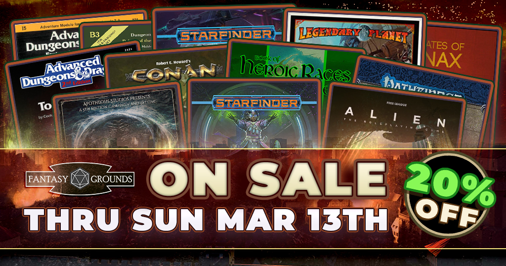 ON SALE THIS WEEK THRU SUNDAY, 13TH OF MARCH 2022D&D Classics: PHBR11 The Complete Ranger's Handbook Publisher: Wizards of the Coast System: D&D Classics - AD&D 1E/2EType: Accessoryhttps://store.steampowered.com/app/1097080 D&D Classics: Tome of Magic (2E) Publisher: Wizards of the Coast System: D&D Classics - AD&D 1E/2EType: Accessoryhttps://store.steampowered.com/app/1142370 D&D Classics: Complete Druid's Handbook Publisher: Wizards of the Coast System: D&D Classics - AD&D 1E/2EType: Accessoryhttps://store.steampowered.com/app/1317920 D&D Classics: I5 Lost Tomb of Martek (1E) Publisher: Wizards of the Coast System: D&D Classics - AD&D 1E/2EType: Adventurehttps://store.steampowered.com/app/1615690 D&D Classics: B3 Palace of the Silver Princess (Basic) Publisher: Wizards of the Coast System: D&D Classics - AD&D 1E/2EType: Adventurehttps://store.steampowered.com/app/1698500 Pathfinder RPG - Rise of the Runelords Anniversary Edition Publisher: Paizo Inc.System: Pathfinder RPG and D&D 3.5/ OGLType: Adventurehttps://store.steampowered.com/app/627030 Pathfinder RPG - Advanced Race Guide Publisher: Paizo Inc.System: Pathfinder RPG and D&D 3.5/ OGLType: Core Ruleshttps://store.steampowered.com/app/1014870 Starfinder RPG - Core Rules Publisher: Paizo Inc.System: StarfinderType: Core Ruleshttps://store.steampowered.com/app/790090 Starfinder Character Operations Manual Publisher: Paizo Inc.System: StarfinderType: Core Ruleshttps://store.steampowered.com/app/1254650 Pathfinder 2 RPG - Pathfinder Advanced Player's Guide Publisher: Paizo Inc.System: Pathfinder 2.0Type: Core Ruleshttps://store.steampowered.com/app/1377860 Pathfinder RPG - Strategy Guide Publisher: Paizo Inc.System: Pathfinder RPG and D&D 3.5/ OGLType: Accessoryhttps://store.steampowered.com/app/1433260 Pathfinder RPG - Urban Starter Set Publisher: Paizo Inc.System: Generic Add-onsType: Map Packhttps://store.steampowered.com/app/1656530 Terror Australis - 2nd Edition Publisher: ChaosiumSystem: Call of Cthulhu 7EType: Accessoryhttps://store.steampowered.com/app/1393060 Deadlands: The Weird West: Horror at Headstone Hill Publisher: Pinnacle Entertainment GroupSystem: Savage WorldsType: Adventurehttps://store.steampowered.com/app/1618700 Hellfrost Land of Fire Publisher: Triple Ace GamesSystem: Savage WorldsType: Settinghttps://store.steampowered.com/app/541880 Freedom City (Third Edition) Publisher: Green RoninSystem: Mutants & MastermindsType: Accessoryhttps://store.steampowered.com/app/1382440 Mini-Dungeon Tome Publisher: AAW GamesSystem: 5E CompatibleType: Adventurehttps://store.steampowered.com/app/1010350 The Red Opera: The Last Days of the Warlock Publisher: Indie PublishersSystem: 5E CompatibleType: Settinghttps://store.steampowered.com/app/1765490 Legendary Planet: The Scavenged Codex (5E) Publisher: Legendary GamesSystem: 5E CompatibleType: Adventurehttps://store.steampowered.com/app/574490 Book of Lost Spells (Fifth Edition) Publisher: Frog God GamesSystem: 5E CompatibleType: Accessoryhttps://store.steampowered.com/app/462740 The Pirates of Drinax Publisher: Mongoose PublishingSystem: Traveller 2E (Mongoose)Type: Adventurehttps://store.steampowered.com/app/1661590 Book of Heroic Races: Age of Races Publisher: Jon Brazer EnterprisesSystem: 13th AgeType: Accessoryhttps://store.steampowered.com/app/1180780 Robert E Howard's Conan Roleplaying Game Publisher: Modiphius Entertainment Ltd.System: Conan 2d20Type: Rulesethttps://store.steampowered.com/app/1287960 Colonial Marines Operations Manual Publisher: Free League PublishingSystem: Alien Roleplaying GameType: Settinghttps://store.steampowered.com/app/1724520 NEW RELEASES - FANTASY GROUNDS VTT - Week of February 28th, 2022 March 2, 2022