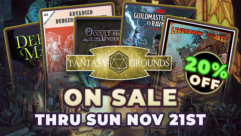 ON SALE THIS WEEK THRU SUNDAY, 21ST OF NOVEMBER 2021 D&D Guildmasters' Guide to Ravnica Publisher: Wizards of the Coast System: D&D fifth edition Type: Setting https://store.steampowered.com/app/973840