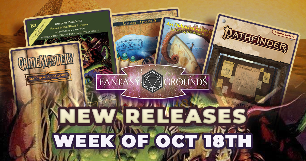 New Releases since Monday, 18th of October 2021D&D Classics: B3 Palace of the Silver Princess (Basic) Publisher: Wizards of the Coast System: D&D Classics - AD&D 1E/2EType: Adventurehttps://store.steampowered.com/app/1698500 Blighted Lands III - Isle of Ill Omen Publisher: Indie PublishersSystem: Castles & CrusadesType: Adventurehttps://store.steampowered.com/app/1787720 Pathfinder RPG - GameMastery Map Pack: Countryside Publisher: Paizo Inc.System: Generic Add-onsType: Map Modulehttps://store.steampowered.com/app/1780660 Treasury of the Pharaohs Publisher: Legendary GamesSystem: 5E CompatibleType: Adventurehttps://store.steampowered.com/app/1784280 D&D Adventurers League 10-03 Divining Evil Publisher: Wizards of the Coast System: D&D fifth editionType: Adventurehttps://store.steampowered.com/app/1482160 Pathfinder 2 RPG - Pathfinder Bounty #8: The Tireless Path Publisher: Paizo Inc.System: Pathfinder 2.0Type: Adventurehttps://store.steampowered.com/app/1780580 NEW RELEASES - Fantasy Grounds - WEEK of OCT 11TH October 15, 2021