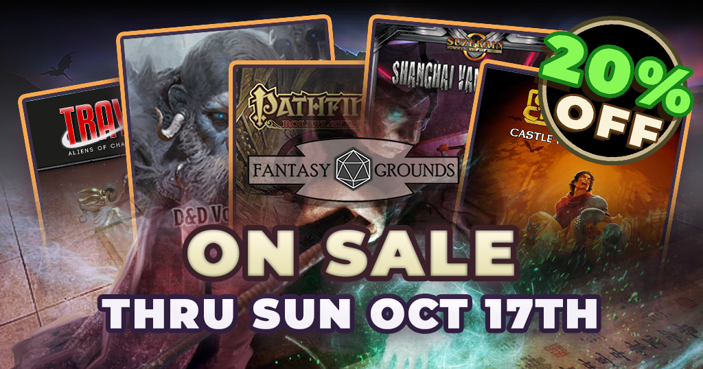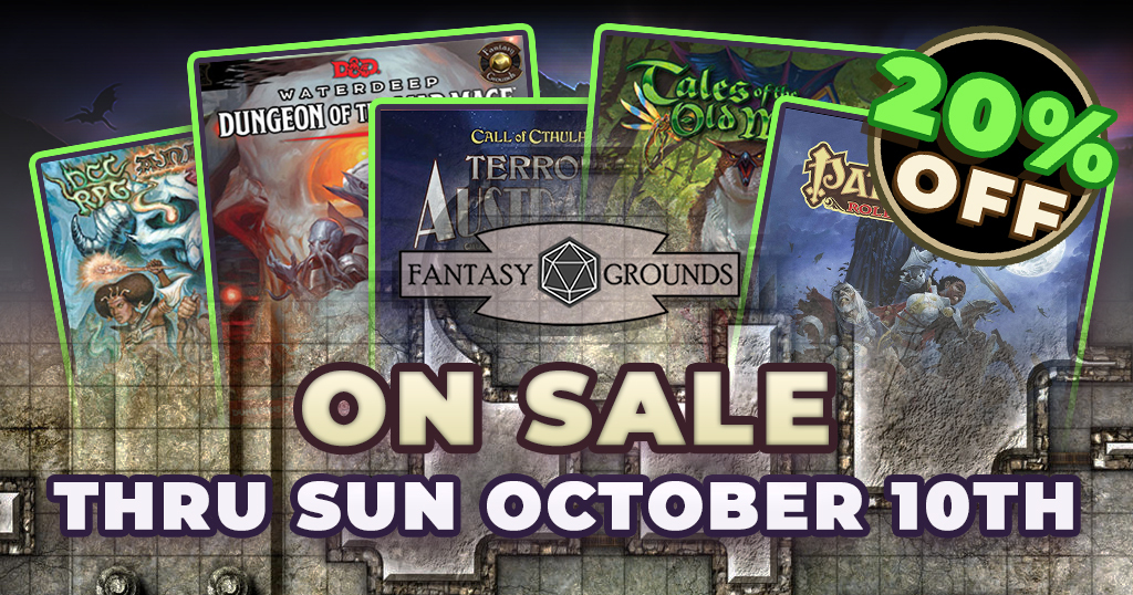 ON SALE THIS WEEK THRU SUNDAY, 10TH OF OCTOBER 2021D&D Waterdeep: Dungeon of the Mad Mage Publisher: Wizards of the Coast System: D&D fifth editionType: Adventurehttps://store.steampowered.com/app/875090 D&D Eberron: Rising From The Last War Publisher: Wizards of the Coast System: D&D fifth editionType: Settinghttps://store.steampowered.com/app/1163790 D&D Classics: Marco Volo: Journey (2E) Publisher: Wizards of the Coast System: D&D Classics - AD&D 1E/2EType: Adventurehttps://store.steampowered.com/app/1540290 D&D Classics: Marco Volo: Arrival (2E) Publisher: Wizards of the Coast System: D&D Classics - AD&D 1E/2EType: Adventurehttps://store.steampowered.com/app/1540280 Pathfinder RPG - Rise of the Runelords Anniversary Edition Publisher: Paizo Inc.System: Pathfinder RPG and D&D 3.5/ OGLType: Adventurehttps://store.steampowered.com/app/627030 Pathfinder 2 RPG - Extinction Curse AP 2: Legacy of the Lost God Publisher: Paizo Inc.System: Pathfinder 2.0Type: Adventurehttps://store.steampowered.com/app/1261680 Starfinder RPG - The Threefold Conspiracy AP 3: Deceivers' Moon Publisher: Paizo Inc.System: StarfinderType: Adventurehttps://store.steampowered.com/app/1411110 Pathfinder RPG: Horror Adventures Publisher: Paizo Inc.System: Pathfinder RPG and D&D 3.5/ OGLType: Accessoryhttps://store.steampowered.com/app/1455950 Pathfinder 2 RPG - Agents of Edgewatch AP 4: Assault on Hunting Lodge Seven Publisher: Paizo Inc.System: Pathfinder 2.0Type: Adventurehttps://store.steampowered.com/app/1495740 Starfinder RPG - Adventure Path #36: Professional Courtesy (Fly Free or Die 3 of 6) Publisher: Paizo Inc.System: StarfinderType: Adventurehttps://store.steampowered.com/app/1582220 Basic Roleplaying (BRP) Ruleset for Fantasy Grounds Publisher: ChaosiumSystem: Basic Roleplaying (BRP)Type: Rulesethttps://store.steampowered.com/app/303331 Terror Australis - 2nd Edition Publisher: ChaosiumSystem: Call of Cthulhu 7EType: Accessoryhttps://store.steampowered.com/app/1393060 Hell on Earth Reloaded Publisher: Pinnacle Entertainment GroupSystem: Savage WorldsType: Settinghttps://store.steampowered.com/app/534580 Savage Worlds Adventure Edition Publisher: Pinnacle Entertainment GroupSystem: Savage Worlds Adventure EditionType: Rulesethttps://store.steampowered.com/app/1040360 Starfall Publisher: Legendary GamesSystem: Pathfinder RPG and D&D 3.5/ OGLType: Adventurehttps://store.steampowered.com/app/549370 Tome of Horrors Complete (Pathfinder Edition) Publisher: Frog God GamesSystem: Pathfinder RPG and D&D 3.5/ OGLType: Accessoryhttps://store.steampowered.com/app/469530 Streets of Zobeck Publisher: Kobold PressSystem: 5E CompatibleType: Accessoryhttps://store.steampowered.com/app/1098950 Tales of the Old Margreve: 5th Edition Forest Adventures Publisher: Kobold PressSystem: 5E CompatibleType: Accessoryhttps://store.steampowered.com/app/1110450 Warlock Lairs Volume 1 Publisher: Kobold PressSystem: 5E CompatibleType: Adventurehttps://store.steampowered.com/app/1098970 Fifth Edition Fantasy #5: Into the Dragon's Maw Publisher: Goodman GamesSystem: 5E CompatibleType: Adventurehttps://store.steampowered.com/app/1121870 Dungeon Crawl Classics RPG Annual Publisher: Goodman GamesSystem: Dungeon Crawl ClassicsType: Accessoryhttps://store.steampowered.com/app/1312340 NEW RELEASES - Fantasy Grounds - WEEK of SEPT 27th October 1, 2021