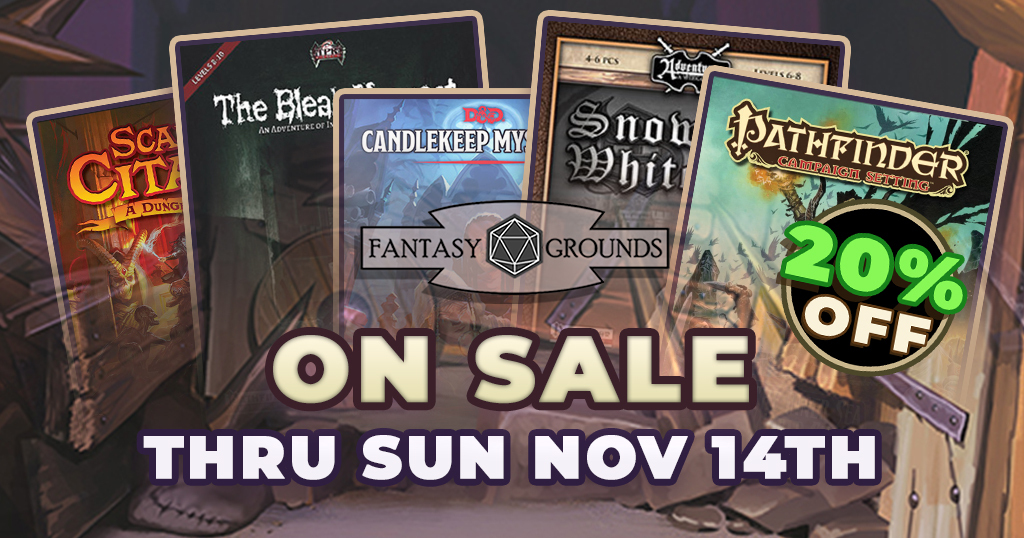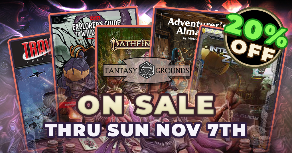 ON SALE THIS WEEK THRU SUNDAY, 31ST OF OCTOBER 2021D&D The Rise of Tiamat Publisher: Wizards of the Coast System: D&D fifth editionType: Adventurehttps://store.steampowered.com/app/357350 D&D Classics: Complete Wizard's Handbook Publisher: Wizards of the Coast System: D&D Classics - AD&D 1E/2EType: Accessoryhttps://store.steampowered.com/app/1078220 D&D Classics: I1 Dwellers of the Forbidden City Publisher: Wizards of the Coast System: D&D Classics - AD&D 1E/2EType: Adventurehttps://store.steampowered.com/app/1082420 D&D Baldur's Gate: Descent Into Avernus Publisher: Wizards of the Coast System: D&D fifth editionType: Adventurehttps://store.steampowered.com/app/1094900 Pathfinder RPG - Hell's Rebels AP 5: The Kintargo Contract Publisher: Paizo Inc.System: Pathfinder RPG and D&D 3.5/ OGLType: Adventurehttps://store.steampowered.com/app/770130 Starfinder RPG - Dead Suns AP 3: Splintered Worlds Publisher: Paizo Inc.System: StarfinderType: Adventurehttps://store.steampowered.com/app/793470 Pathfinder RPG - Return of the Runelords AP 2: It Came from Hollow Mountain Publisher: Paizo Inc.System: Pathfinder RPG and D&D 3.5/ OGLType: Adventurehttps://store.steampowered.com/app/916720 Pathfinder RPG - Carrion Crown AP 4: Wake of the Watcher Publisher: Paizo Inc.System: Pathfinder RPG and D&D 3.5/ OGLType: Adventurehttps://store.steampowered.com/app/984850 Pathfinder Flip-Mat: Tavern Multi-Pack Publisher: Paizo Inc.System: Generic Add-onsType: Map Modulehttps://store.steampowered.com/app/1045420 Pathfinder 2 RPG - Pathfinder Lost Omens World Guide Publisher: Paizo Inc.System: Pathfinder 2.0Type: Accessoryhttps://store.steampowered.com/app/1146460 Starfinder RPG -Attack of the Swarm AP 4: The Forever Reliquary Publisher: Paizo Inc.System: StarfinderType: Adventurehttps://store.steampowered.com/app/1241090 Pathfinder 2 RPG - Extinction Curse AP 5: Lord of the Black Sands Publisher: Paizo Inc.System: Pathfinder 2.0Type: Adventurehttps://store.steampowered.com/app/1328640 Starfinder RPG - The Threefold Conspiracy AP 4: The Hollow Cabal Publisher: Paizo Inc.System: StarfinderType: Adventurehttps://store.steampowered.com/app/1422320 Starfinder RPG - Alien Archive 4 Publisher: Paizo Inc.System: StarfinderType: Core Ruleshttps://store.steampowered.com/app/1481920 Nameless Horrors (CoC7E) Publisher: ChaosiumSystem: Call of Cthulhu 7EType: Adventurehttps://store.steampowered.com/app/647340 Down Darker Trails Publisher: ChaosiumSystem: Call of Cthulhu 7EType: Adventurehttps://store.steampowered.com/app/1119370 Players Guide to Aihrde Publisher: Troll Lord GamesSystem: Castles & CrusadesType: Core Ruleshttps://store.steampowered.com/app/843240 Weird Wars II Publisher: Pinnacle Entertainment GroupSystem: Savage WorldsType: Settinghttps://store.steampowered.com/app/346660 Hellfrost Journeys Publisher: Triple Ace GamesSystem: Savage WorldsType: Accessoryhttps://store.steampowered.com/app/874620 The Valkyrie: A New Hybrid Class Publisher: Total Party Kill GamesSystem: 5E CompatibleType: Accessoryhttps://store.steampowered.com/app/823250 The Blight Game Masters Guide Publisher: Frog God GamesSystem: 5E CompatibleType: Adventurehttps://store.steampowered.com/app/805200 Courts of the Shadow Fey Publisher: Kobold PressSystem: 5E CompatibleType: Adventurehttps://store.steampowered.com/app/1199750 Tripwire Publisher: Mongoose PublishingSystem: Traveller 1E (Mongoose)Type: Adventurehttps://store.steampowered.com/app/878200 Behind the Claw Publisher: Mongoose PublishingSystem: Traveller 2E (Mongoose)Type: Accessoryhttps://store.steampowered.com/app/1394000 NEW RELEASES - Fantasy Grounds - WEEK of OCT 18TH October 21, 2021