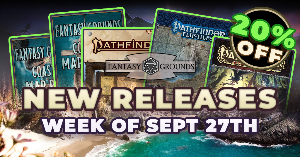 New Releases since Monday, 27th of September 2021FG Coastal Map pack Publisher: SmiteWorks USA, LLCSystem: Generic Add-onsType: Map Modulehttps://store.steampowered.com/app/1766610 FG Coastal Map Pack 2 Publisher: SmiteWorks USA, LLCSystem: Generic Add-onsType: Map Modulehttps://store.steampowered.com/app/1766620 Pathfinder 2 RPG - Pathfinder Bounty #9: Fishing in Anthusis Publisher: Paizo Inc.System: Pathfinder 2.0Type: Adventurehttps://store.steampowered.com/app/1758270 https://store.steampowered.com/app/1656530 Pathfinder RPG - Wrath of the Righteous AP 4: The Midnight Isles Publisher: Paizo Inc.System: Pathfinder RPG and D&D 3.5/ OGLType: Adventurehttps://store.steampowered.com/app/1396700 Pathfinder RPG - Urban Starter Set Publisher: Paizo Inc.System: Generic Add-onsType: Map Module