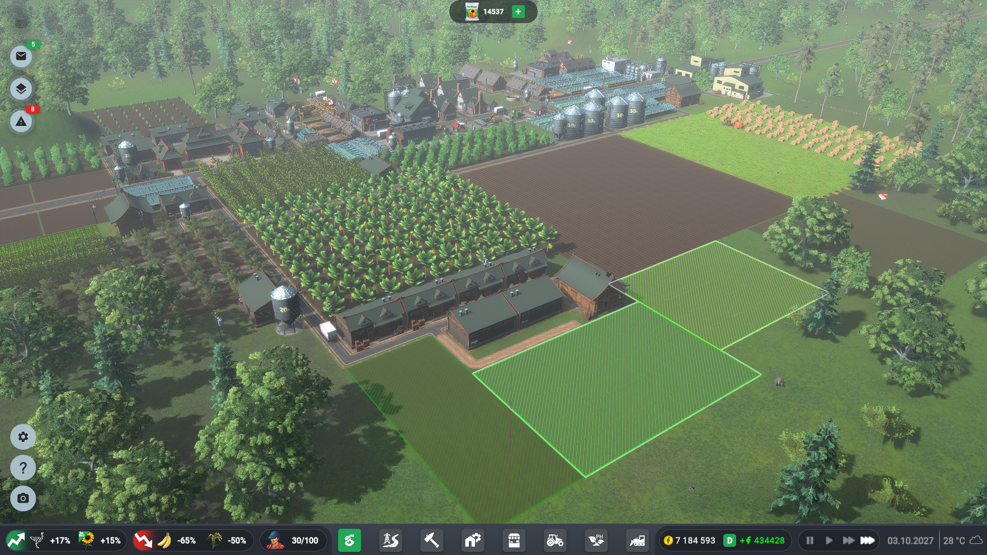 Fields and work in the fields -> More metrics for fields: soil class, pH, nitrogen levels. -> Crop rotation -> Connecting/disconnecting fields -> Possibility of automatic mechanical/manual operation or independent -> selection of vehicles and workers -> Ability to add workers to ongoing field work