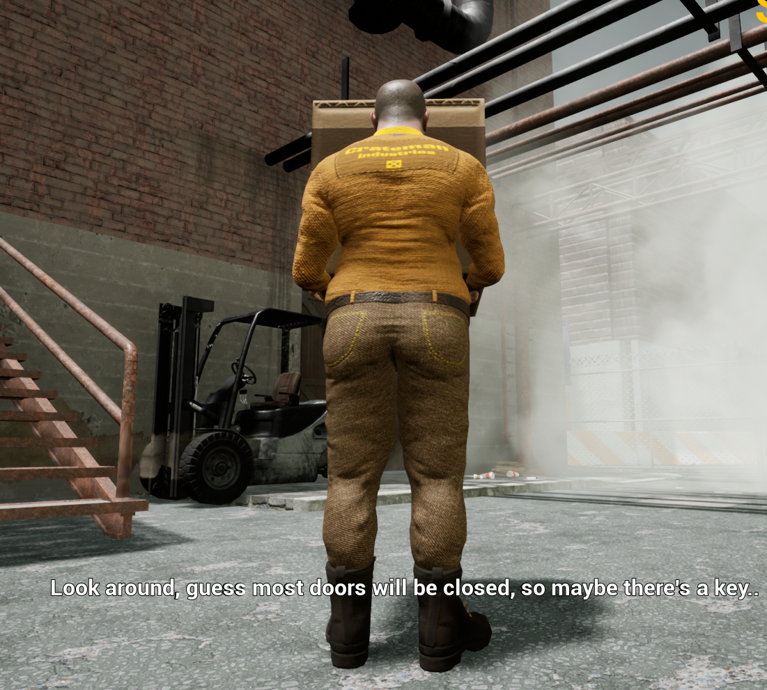 Today we come to you with a new character model added to the game. We've added basic mechanics of moving and lifting various objects. We have also added the ability to drive vehicles and the possibility of tipping over while carrying packages.