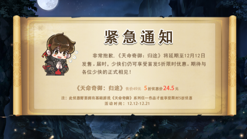 《天命奇御:归途》将于12月12日在Steam、Wegame、凤凰商城及蒸汽平台正式发售。玩家在任一平台购买游戏,可享首发超低5折优惠,只需24.5元,即可畅游归途!
