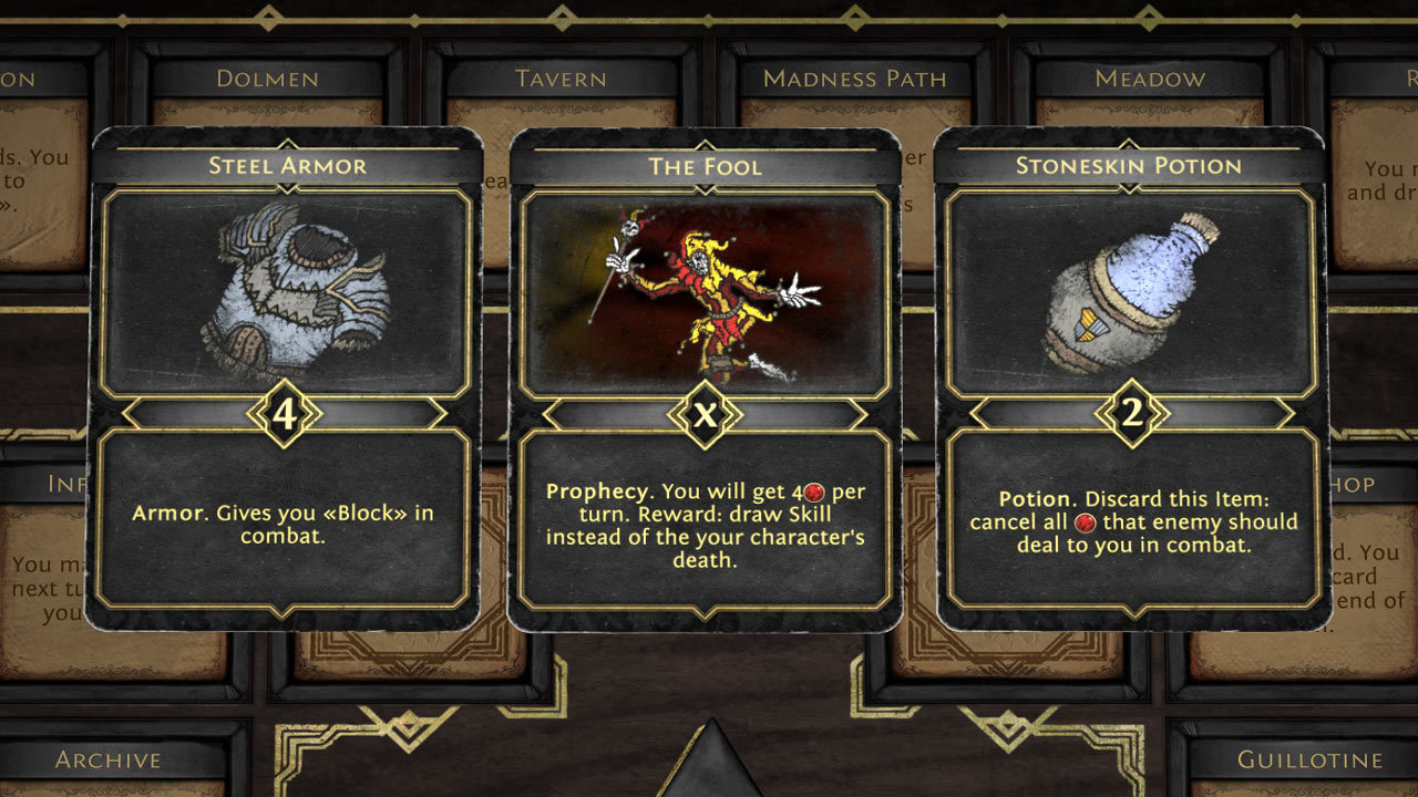 3 cards: «Steel Armor», «The Fool» and «Stoneskin Potion».
