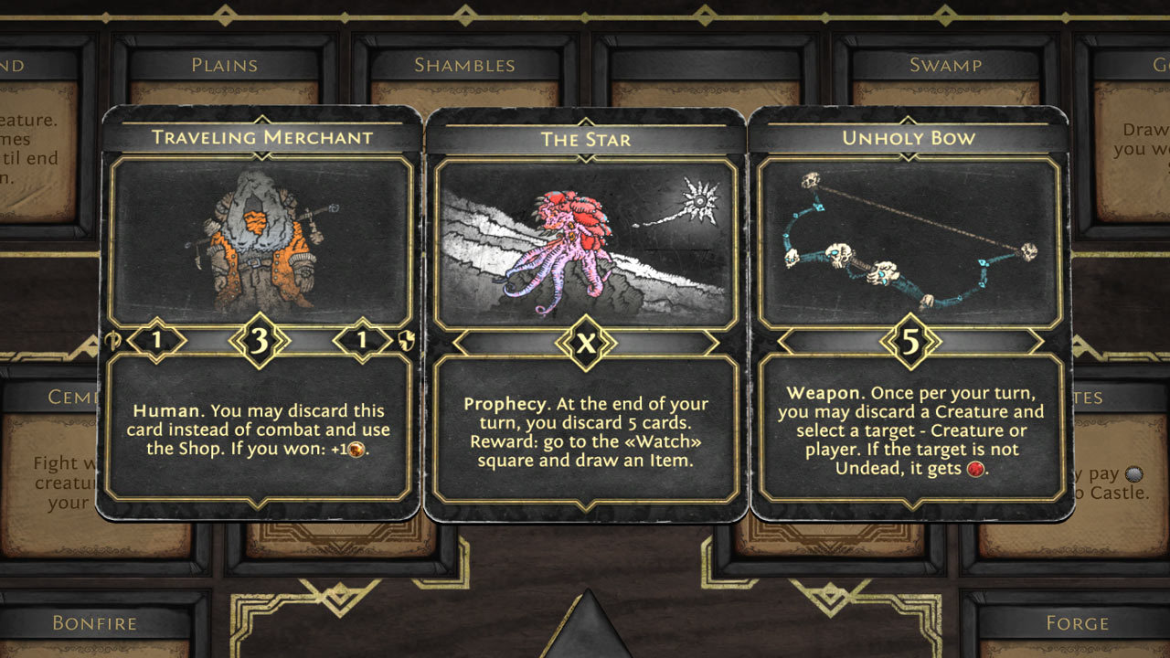 3 cards: «Traveling Merchant», «The Star» and «Unholy Bow».