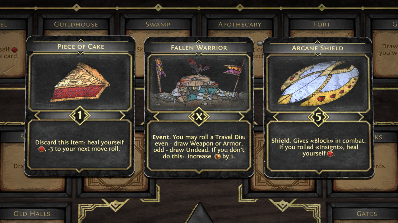 3 cards: «Piece of Cake», «Fallen Warrior» and «Arcane Shield».