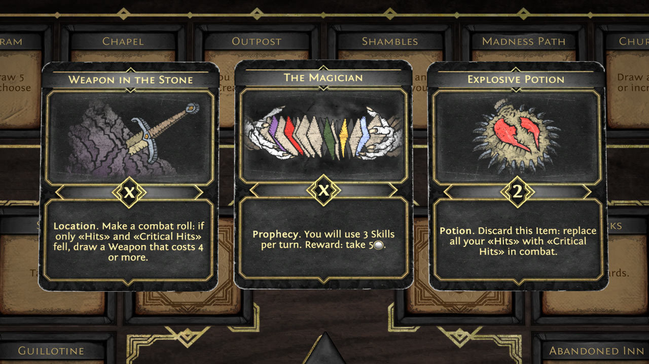 3 cards: «Weapon in the Stone», «The Magician» and «Explosive Potion».