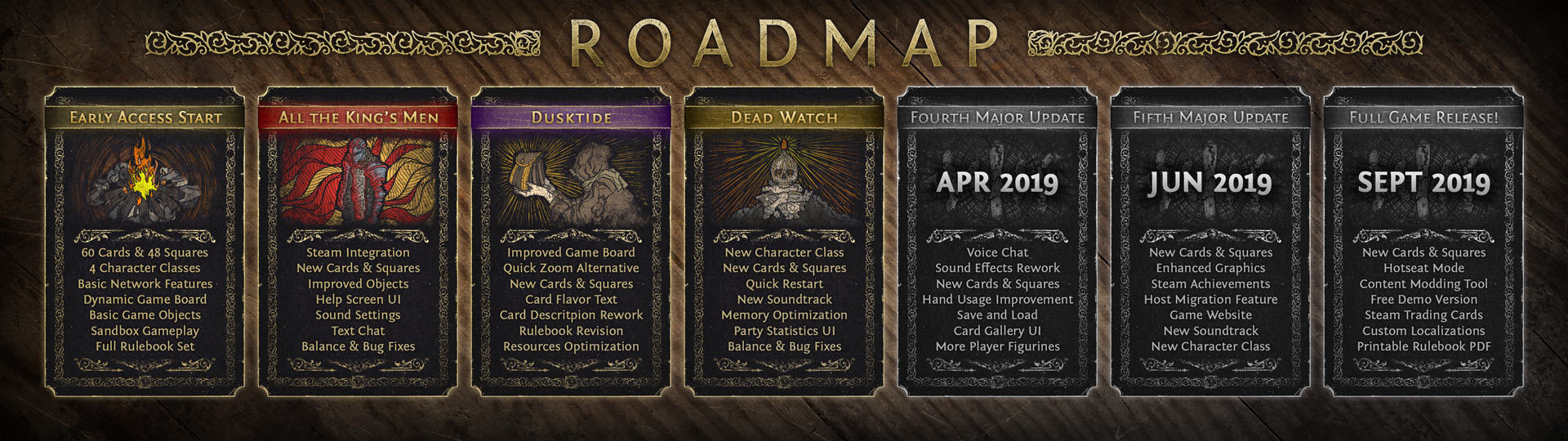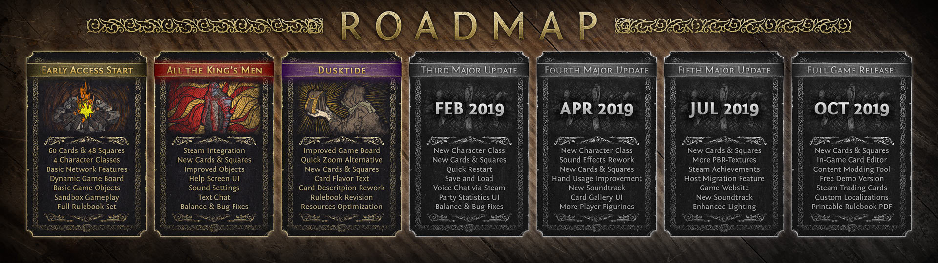 On the attached roadmap, you can also see the estimated time of release of other updates. But remember that this information may change later. For example, we planned an improved game board at a later date, but later we decided to include it in the «Dusktide» update.