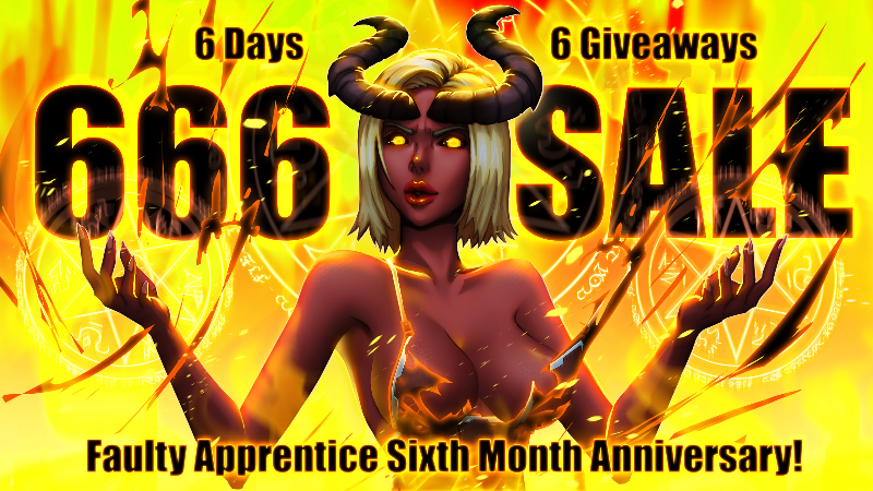 To celebrate 6 month anniversary of Faulty Apprentice, we are having a 6 Day Sale and giving away 6 Download Keys! Such a devilous deal, we are calling our 666 Sale!!!