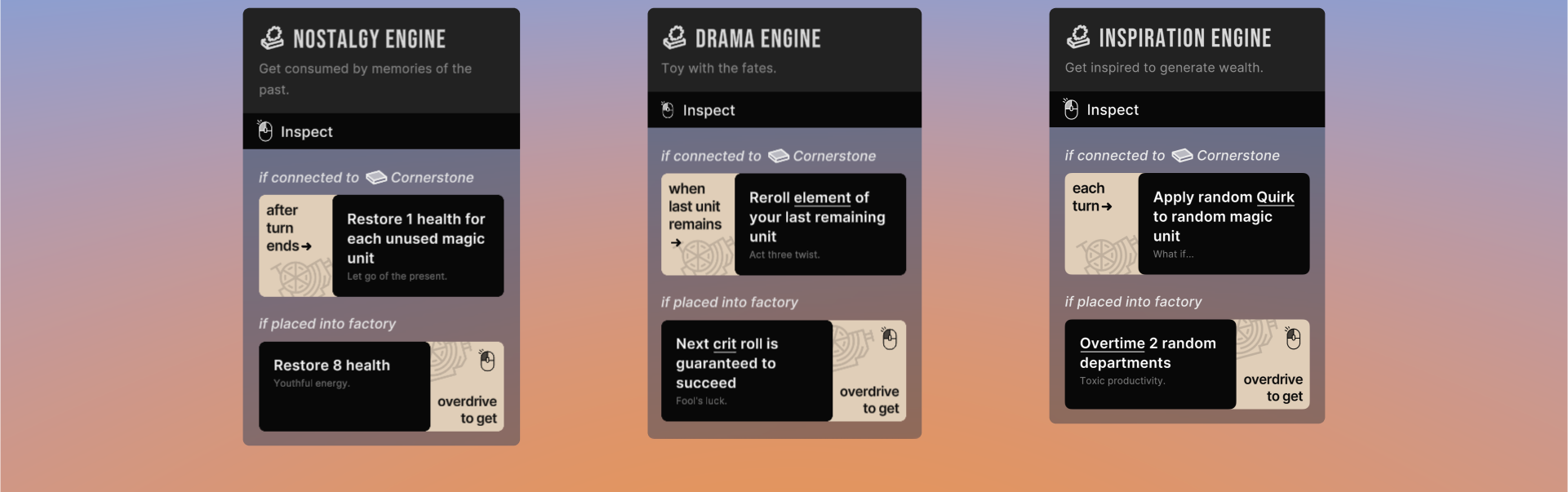 Inspiration Engine makes your workers work twice as hard for the same pay. Overtime your departments after they've already taken their turn, or apply a random Quirk to a random magic unit on the start of a turn.