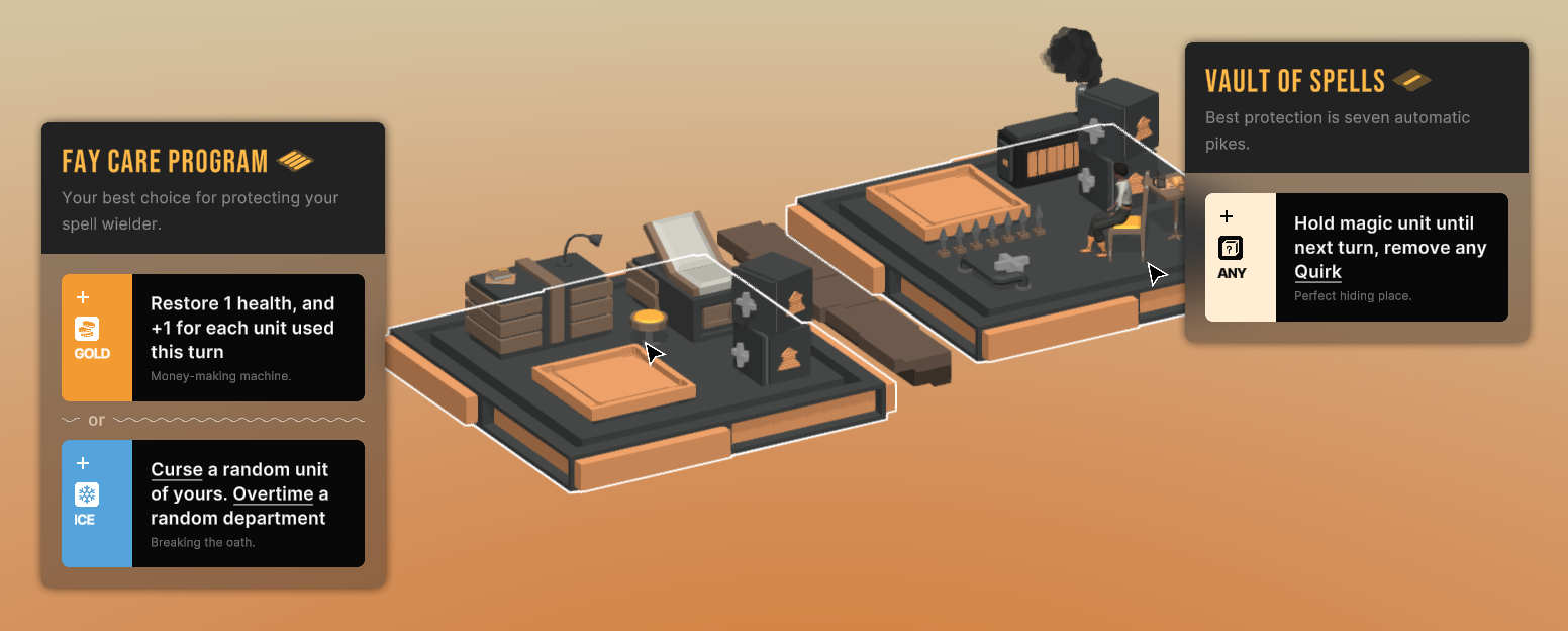 Fay Care is now focused on health/curses, and can use the mechanic from Wires on the last policy tier. It can also use a new Overtime keyword, which reenables the department that was busy that turn. Vault can now remove any Quirk from a magic unit (Doubled, Cursed, Arrogant, etc.)