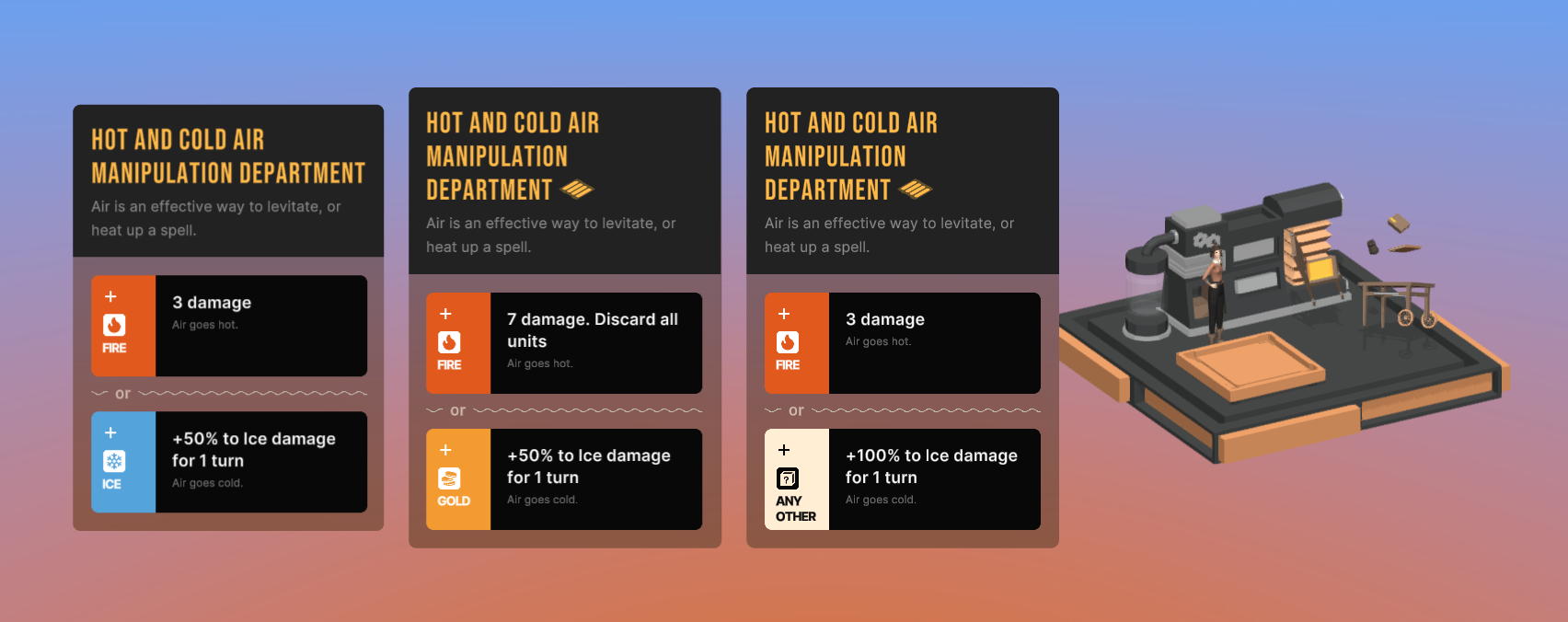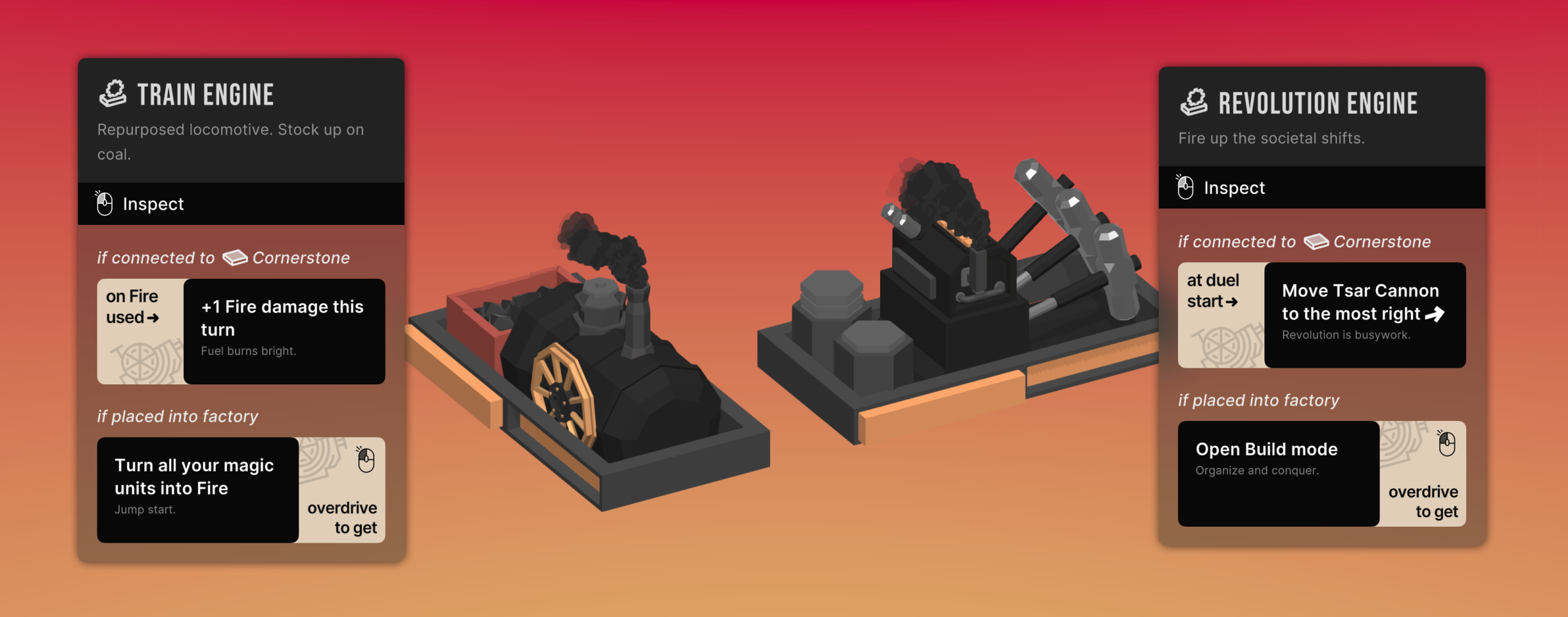 Train Engine has been reworked slightly. Its passive now grants you +1 Fire damage for the rest of a turn when you use a Fire unit. Previous passive always gave you 1 gold unit each turn, which I now think is a bit too predictable. Gaining momentum!