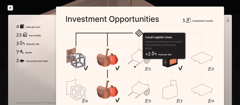 Investments: new mechanic for cross-adventure progression in Edge Harbor. Allows you to buy upgrades for your factory using Investment Rounds. There are currently 5 rows of Investments, affecting your Units per Turn, Health, Heal per Isle, Factory Power, and Max Power per Department. You get Investment Rounds for completing adventures. You will get them retroactively in old saves. You can access Investments through the board in the HQ.