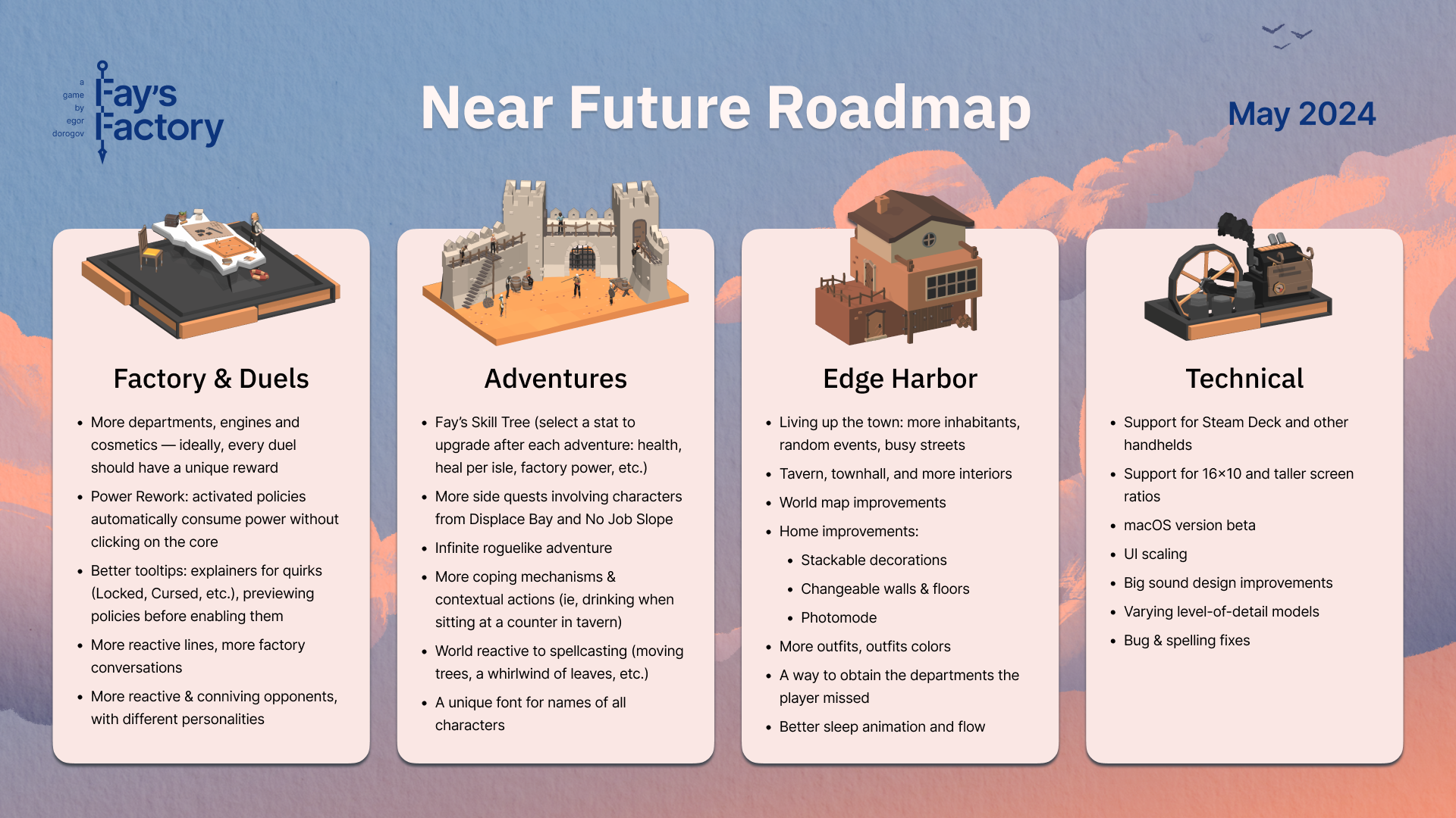 This roadmap focuses on the things I want to improve or add in the near future. Once I'm done with most of these, I'll focus on new big adventures, including Act 2 and Act 3. That doesn't mean that there will be a content drought for now: apart from the new parts, outfits and decorations, there're at least 3 more side-quests coming in the next few weeks — your Overseers’ continuous employment at the Fourth Cartel is safe with us.